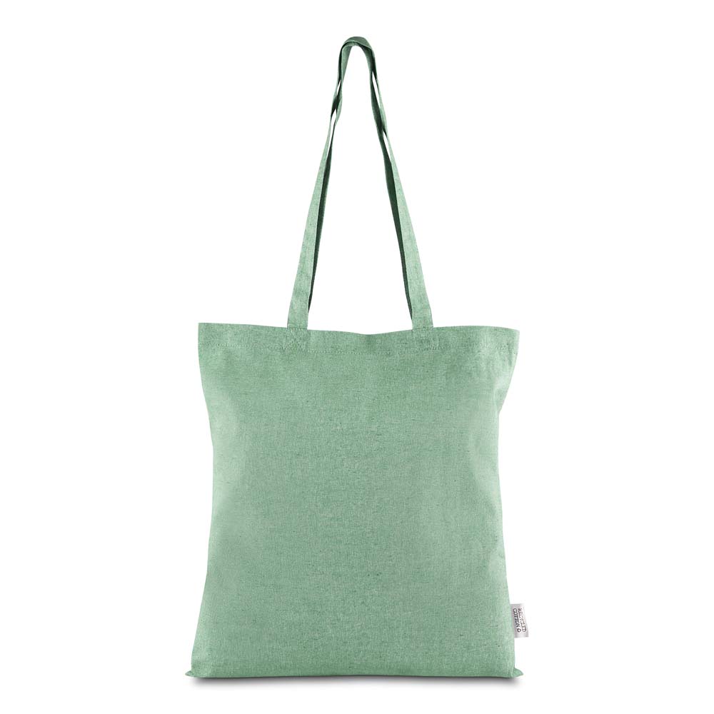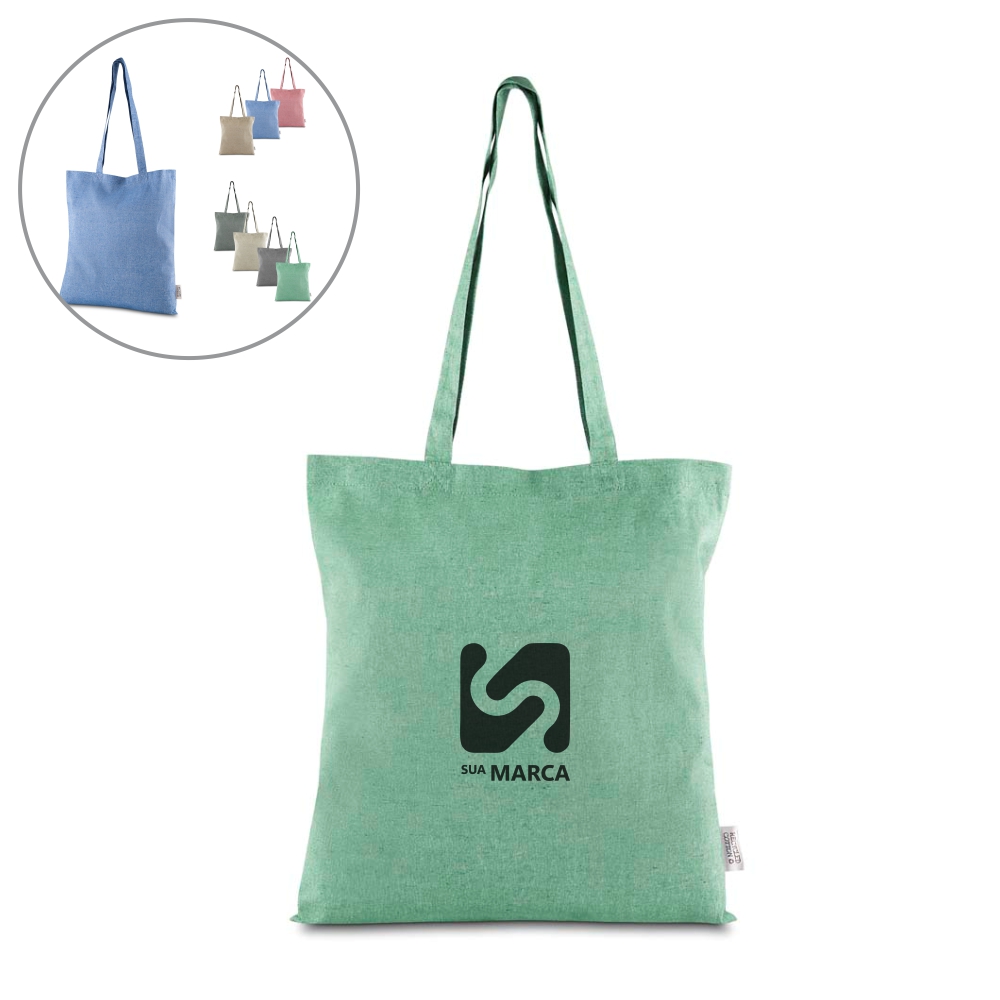 Sacola confeccionada em algodão mescla reciclado, gramatura 140 g/m². Possui alça de 65 cm ponta a ponta.