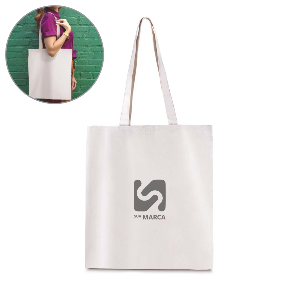 Sacola em Algodão Cru de 220g/m². Alça com altura de 30 cm, ideal para transporte.