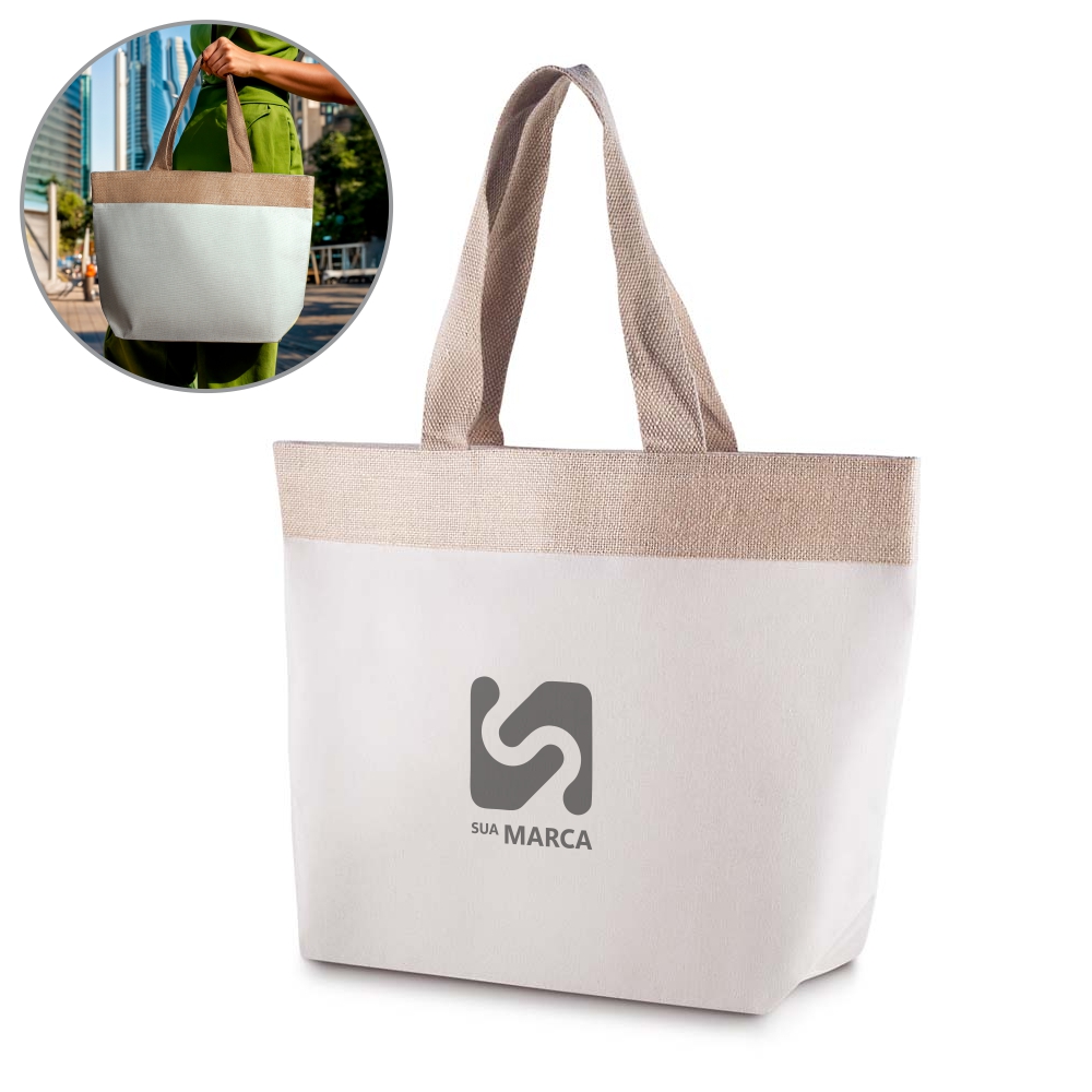 Sacola em Algodão Cru 220g/m² com detalhe em Juta. Alça com altura de 24 cm, ideal para transporte.