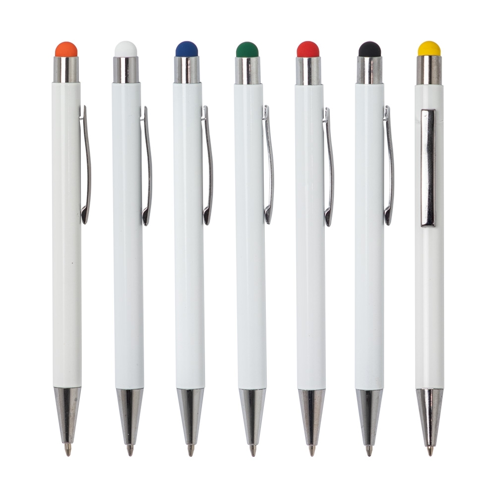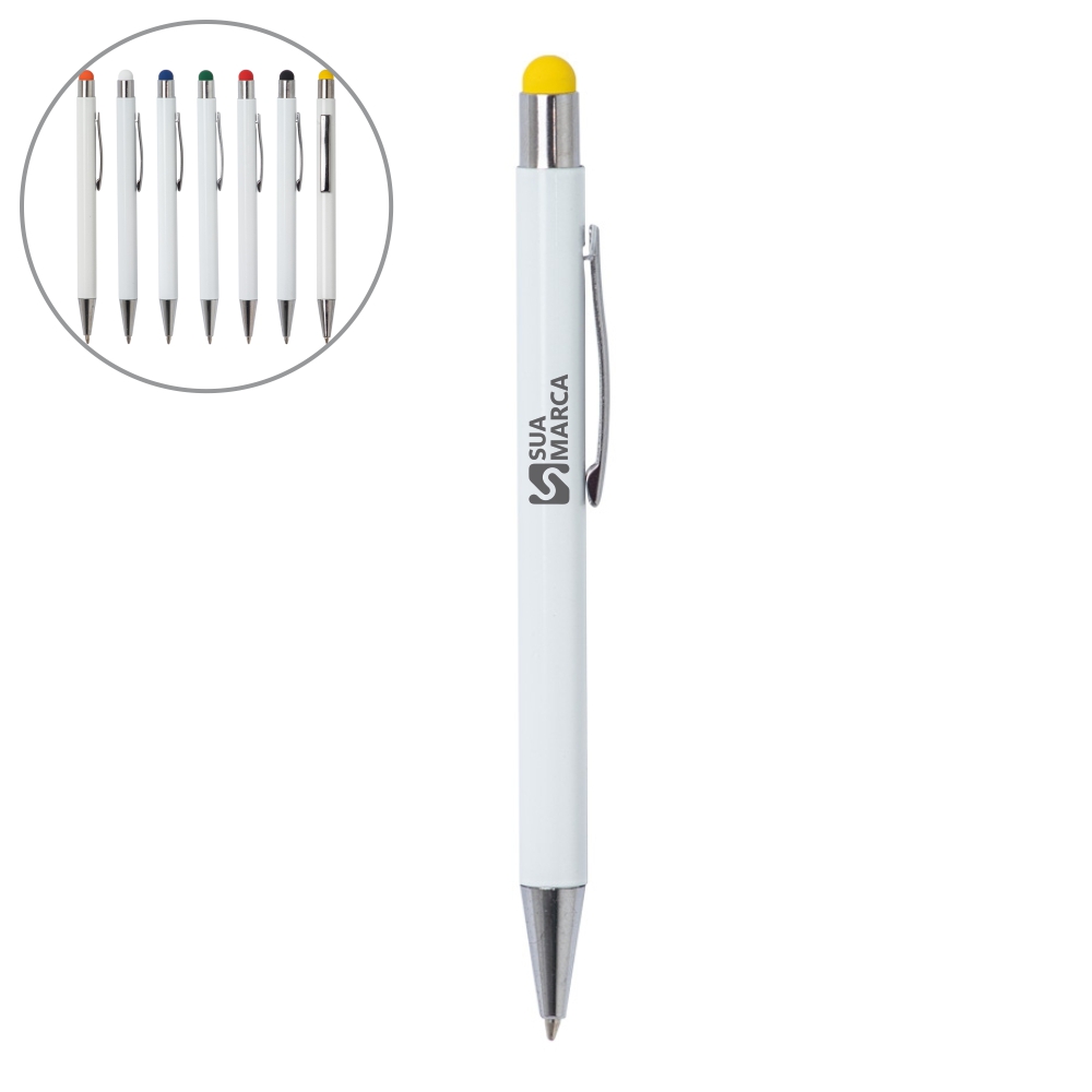 Descrição: Caneta metálica com touch screen, carga esferográfica azul e acionamento por clique.