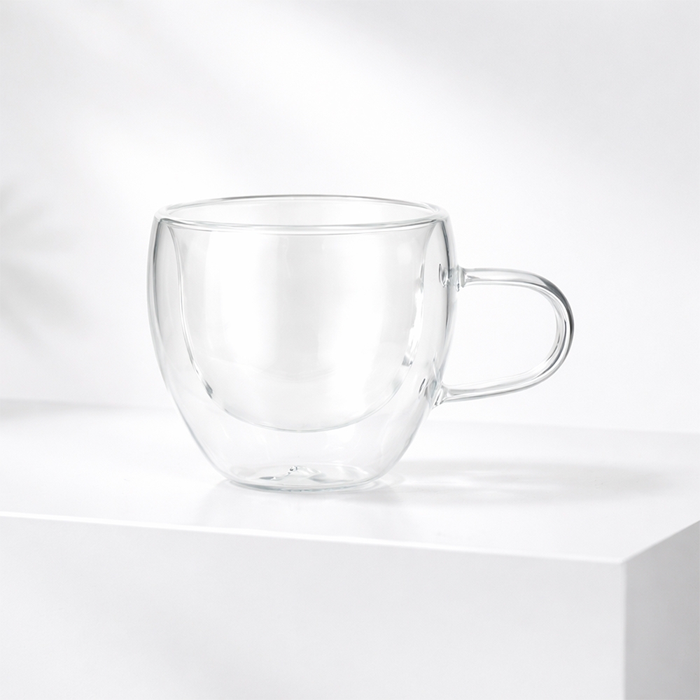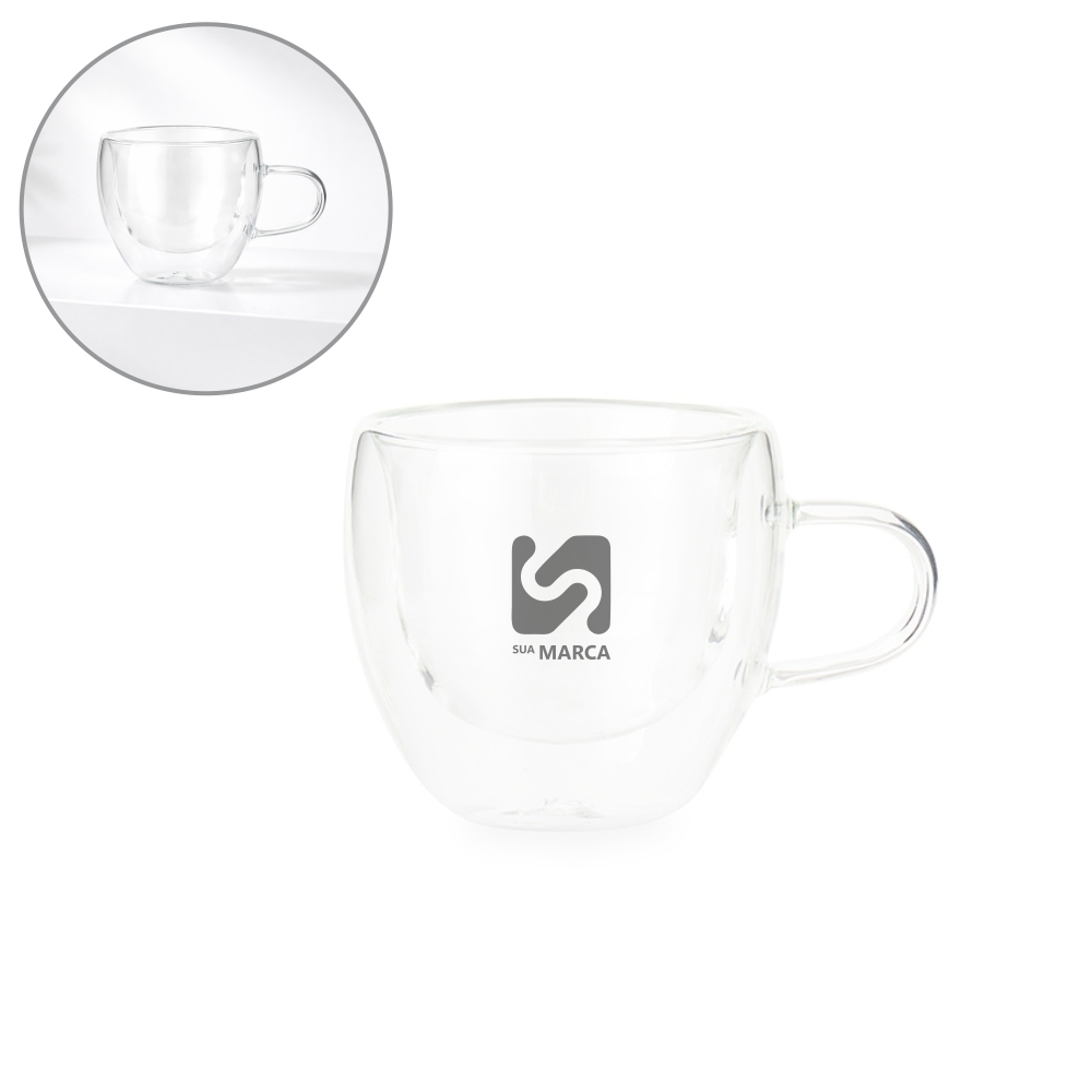 Xícara em vidro borossilicato com capacidade para até 70ml e estrutura de parede dupla, que impede que o calor alcance a parede externa.