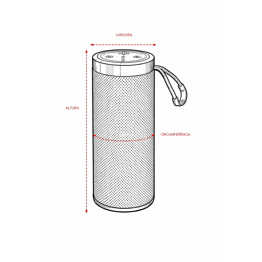 Caixa de som multimídia com estrutura em plástico ABS, revestimento em malha de poliéster, base antiderrapante e alça em nylon com proteção emborrachada, painel de botões superior em silicone e iluminação RGB ajustável. Possui conexão Bluetooth 5.3, rádio FM e tecnologia TWS, que permite sincronizar duas caixas simultaneamente. Conta ainda com entradas USB-A e TF para reprodução de arquivos MP3 via pen drives e cartões microSD, além de conexão USB-C para recarga. Acompanha cabo USB-C.