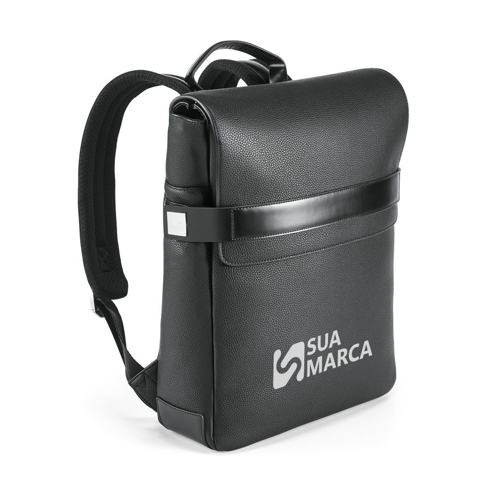A mochila EMPIRE é sofisticada e construída em c.sintético texturado de elevada qualidade. O compartimento principal é composto por 2 divisórias almofadadas, compatíveis com notebook até 14'' e tablet até 10.5'', e diversos bolsos que facilitam a arrumação. Na parte frontal, existe mais um bolso grande. Os fechos laterais têm imã resistente e placas metálicas ideais para personalização. A parte posterior, com sistema de apoio acolchoado para as costas e as alças totalmente almofadadas, garante máximo conforto e os cantos inferiores reforçados asseguram durabilidade. Contém bolsos interiores e fecho. A mochila EMPIRE tem banda para transporte em trolley, o que a torna num objeto versátil e prático tanto para o dia-a-dia como para viagens de negócios. Fornecida em sacola de non-woven. Mochila: 290 x 370 x 90 mm | Sacola de non-woven: 500 x 500 x 80 mm.