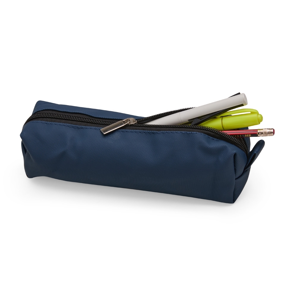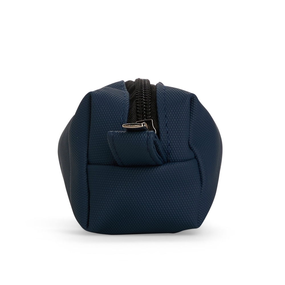 Estojo confeccionado em couro sintético com fechamento em zíper e uma pequena alça para fixação em chaveiro ou gancho.