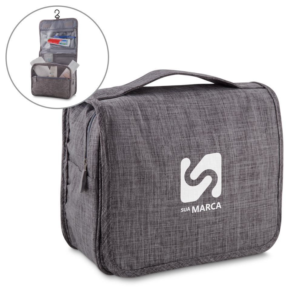 Necessaire em tecido polyester, com excelente espaço interno, bolso frontal e no verso. Suporte para pendurar.
