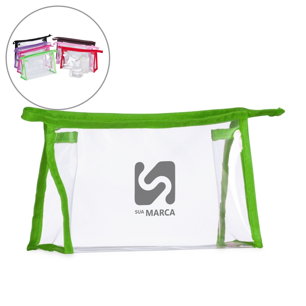 Necessaire plástica transparente com detalhe colorido em nylon.