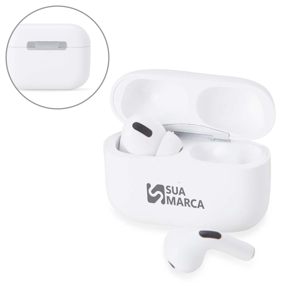 Fone de ouvido bluetooth com comandos touch e case carregador de fechamento magnético. Acompanha USB Lightning.