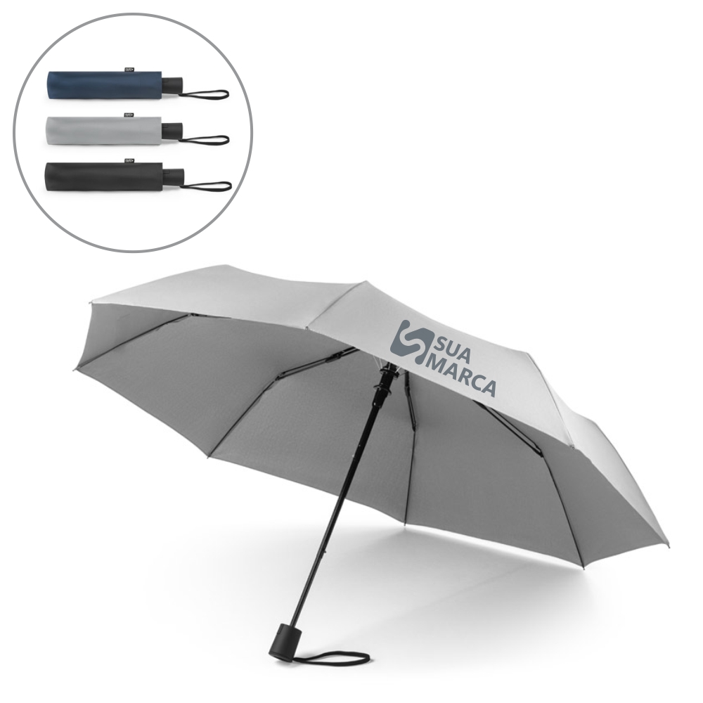 O guarda-chuva, dobrável em 3 secções, tem abertura automática e é à prova de vento. Fornecido em bolsa.