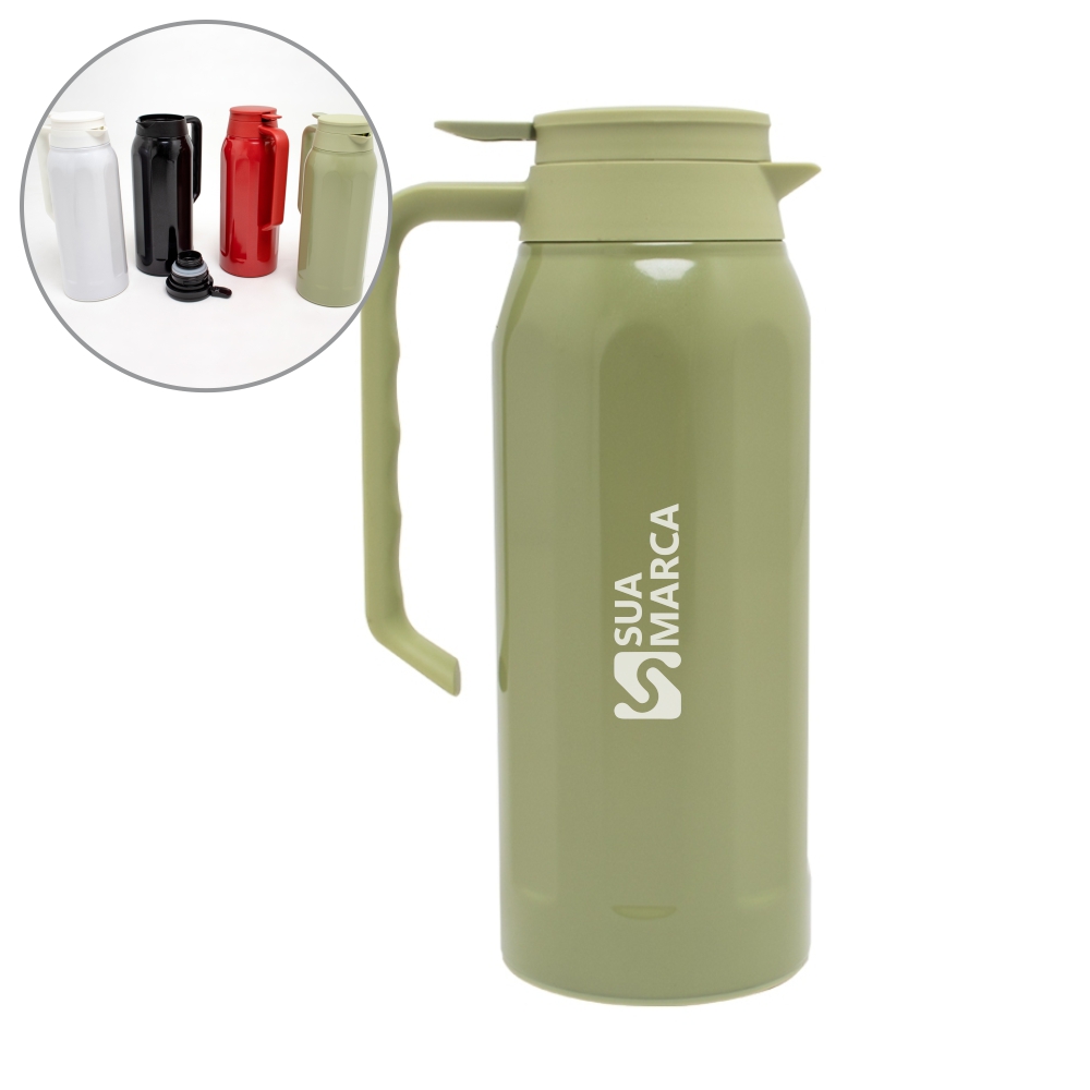 Descrição: Garrafa térmica com capacidade de 1,4 litros, fabricada em aço inoxidável, possui parede dupla e tampa com alavanca de acionamento. Com tampa, alça e base plásticas, a garrafa possui um design com ondulações em relevo e acabamento brilhante.