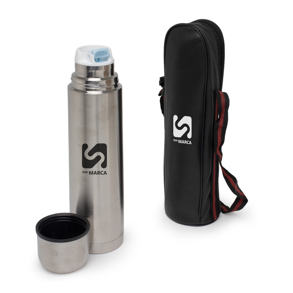 Garrafa térmica parede dupla em inox com capacidade de 750ml, acompanha capa de couro sintético com alça de nylon.