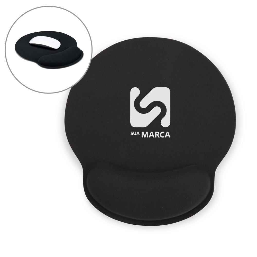 Mouse pad ergonômico de estrutura flexível. Contém superfície em poliéster e base em borracha com textura antiderrapante, além de espuma ergonômica para o punho.