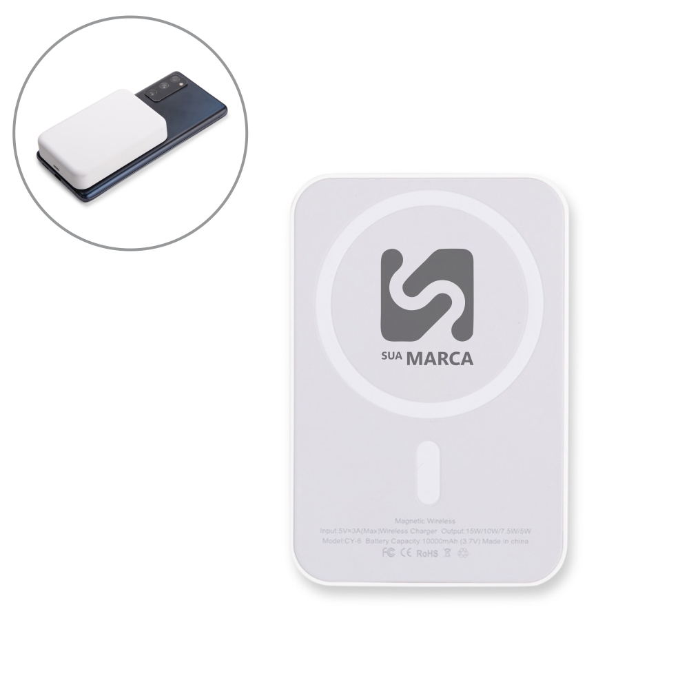 Power bank para carregamento de dispositivos compatíveis com a tecnologia de indução magnética, estrutura em plástico, entrada USB-C para alimentação e capacidade de até 10.000mAh.