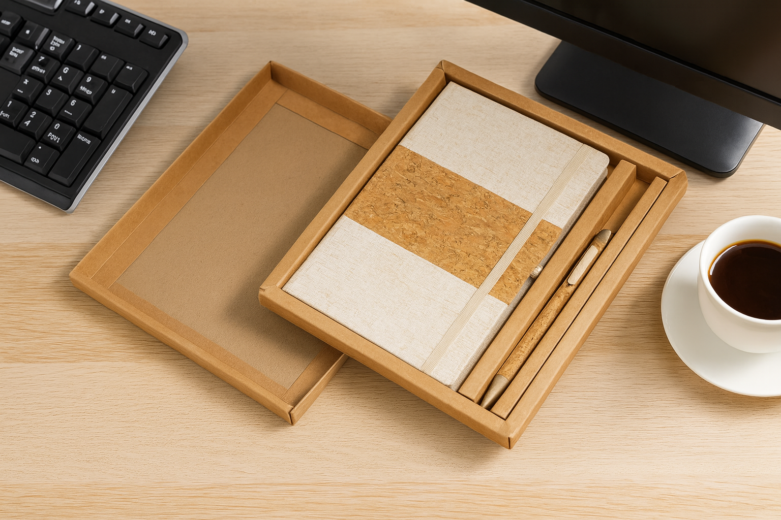 Descrição: Este kit contém uma Caderneta A5 em linho com detalhe em cortiça e suporte para caneta, marcador de página em cetim, aproximadamente 82 folhas com pauta e caneta de cortiça com detalhes em palha de trigo, carga esferográfica azul 1.0mm e acionamento por clique.