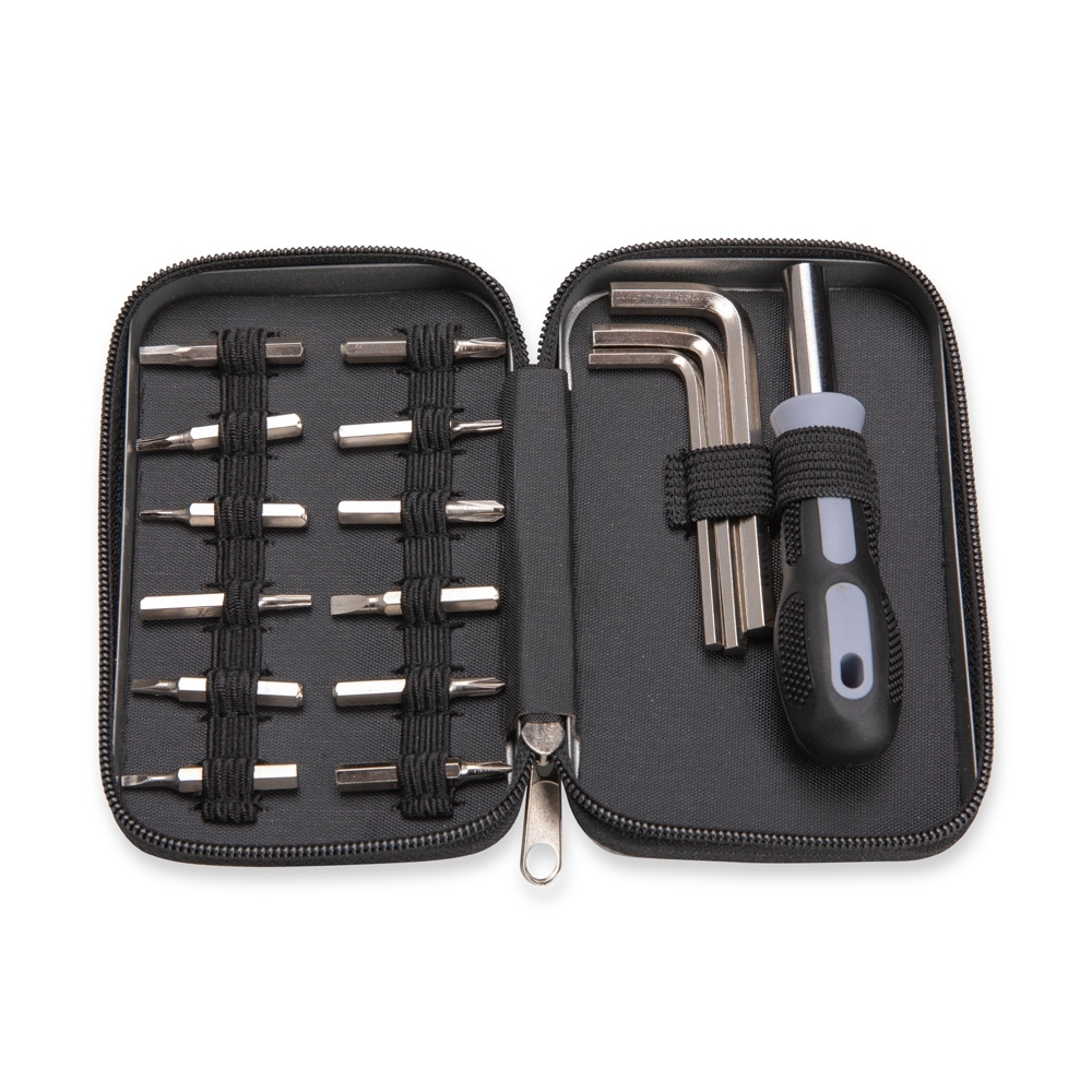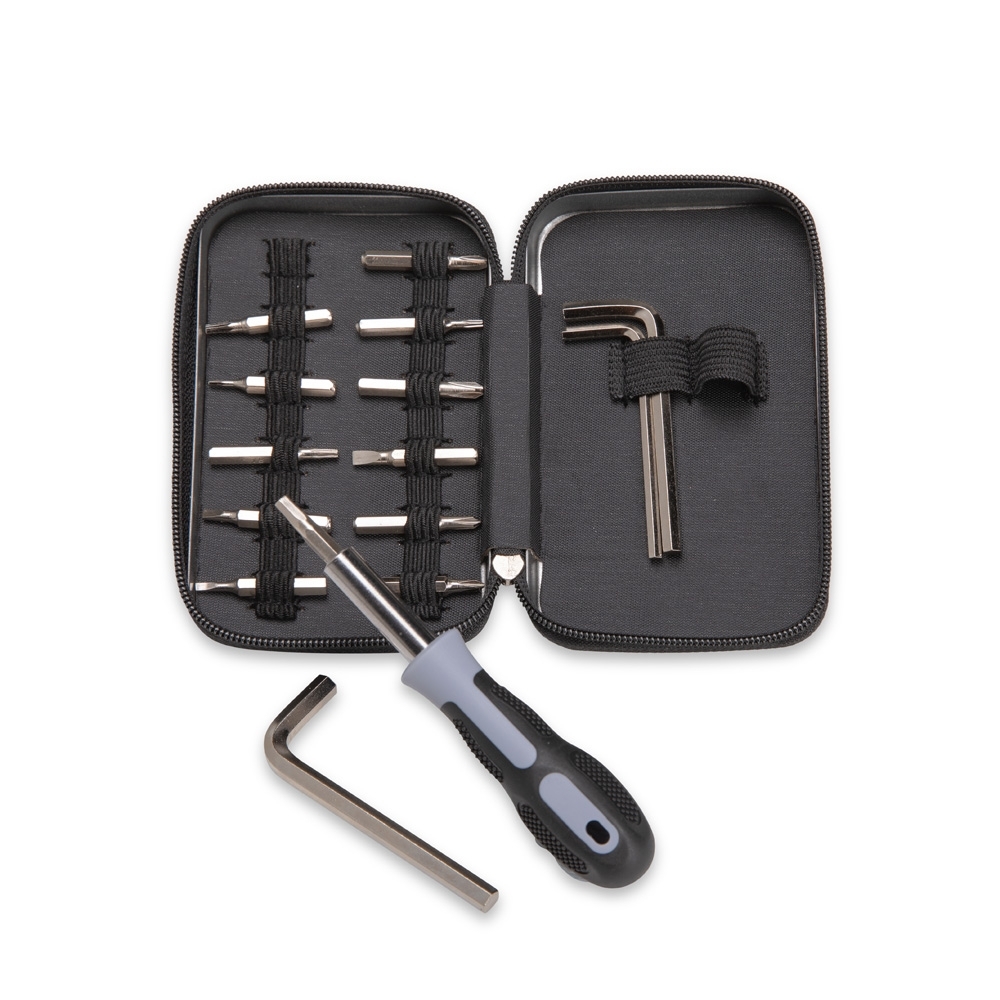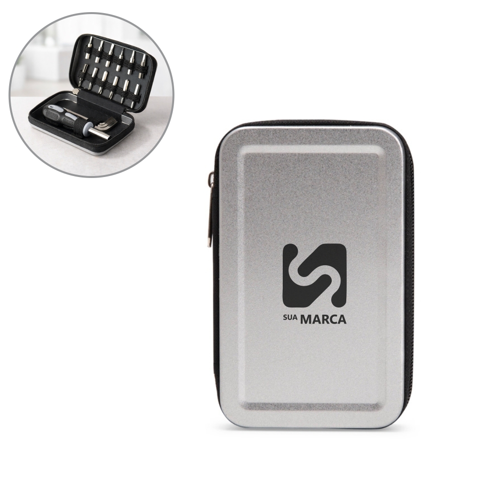 Kit de ferramentas com 16 peças em aço carbono. O conjunto apresenta uma chave porta-bits com ponta magnética, cabo ergonômico em plástico polipropileno (PP) e TPE, 3 chaves L com pontas hexagonais e 12 bits em tamanhos diferentes, incluindo 4 com ponta Phillips, 4 em fenda, 2 Torx e 2 em Allen. Acompanha estojo em aço estanhado com bordas em Oxford e fechamento em zíper.