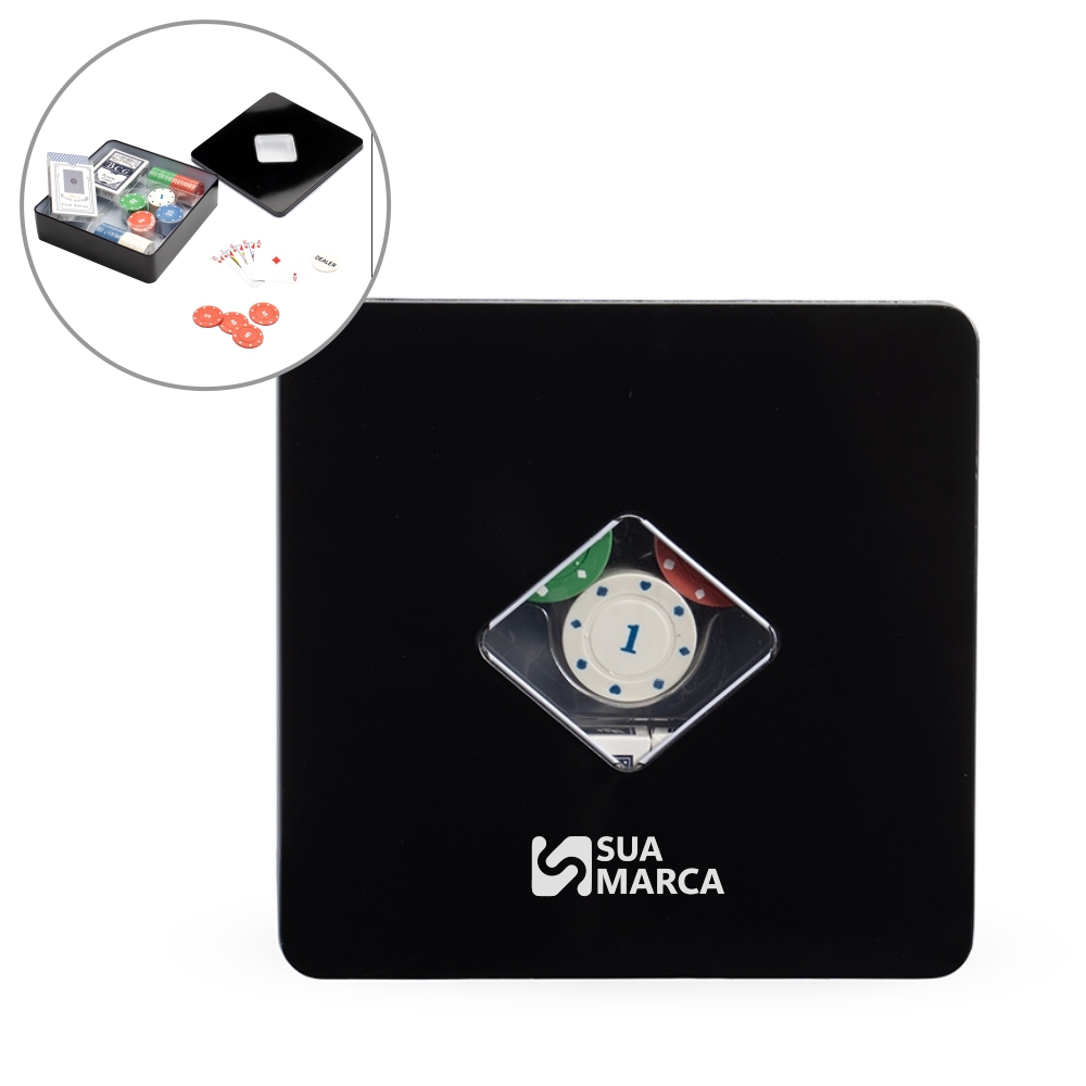 Kit poker formado por dois baralhos completos, com 54 cartas cada, além de uma ficha de dealer e cerca de 100 fichas coloridas, distribuídas em quatro cores com 25 unidades cada. Acompanha um estojo metálico para guardar os itens do conjunto.