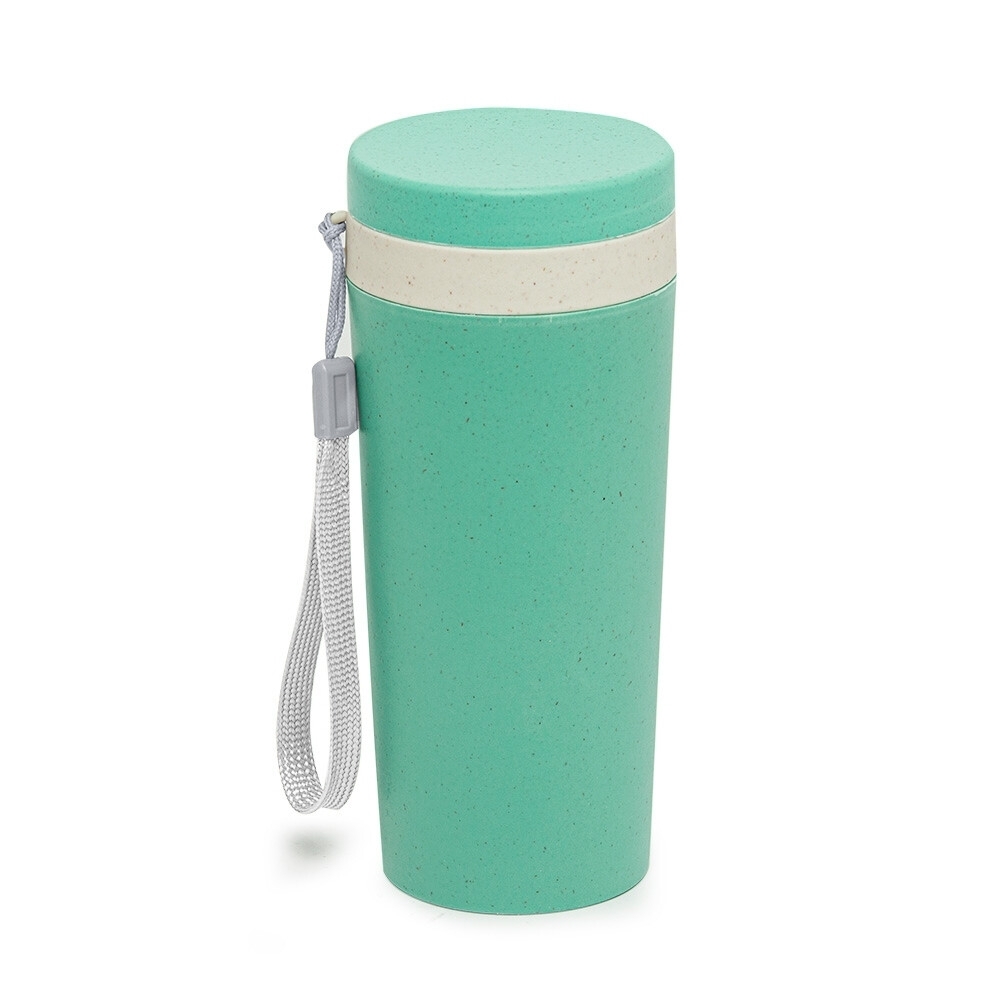 Ref. BX03006 - Copo isotérmico fibra de bambu 350ml com parede dupla e alça. Copo produzido em Polipropileno livre de BPA, possui uma tampa de vedação rosqueável e alça de nylon (removível) para transporte. Conserva a temperatura interna durante um período de 1 à 2 horas, mas não dispõe de isolamento térmico. O copo pode ser levado a lava-louças, geladeiras e micro-ondas.