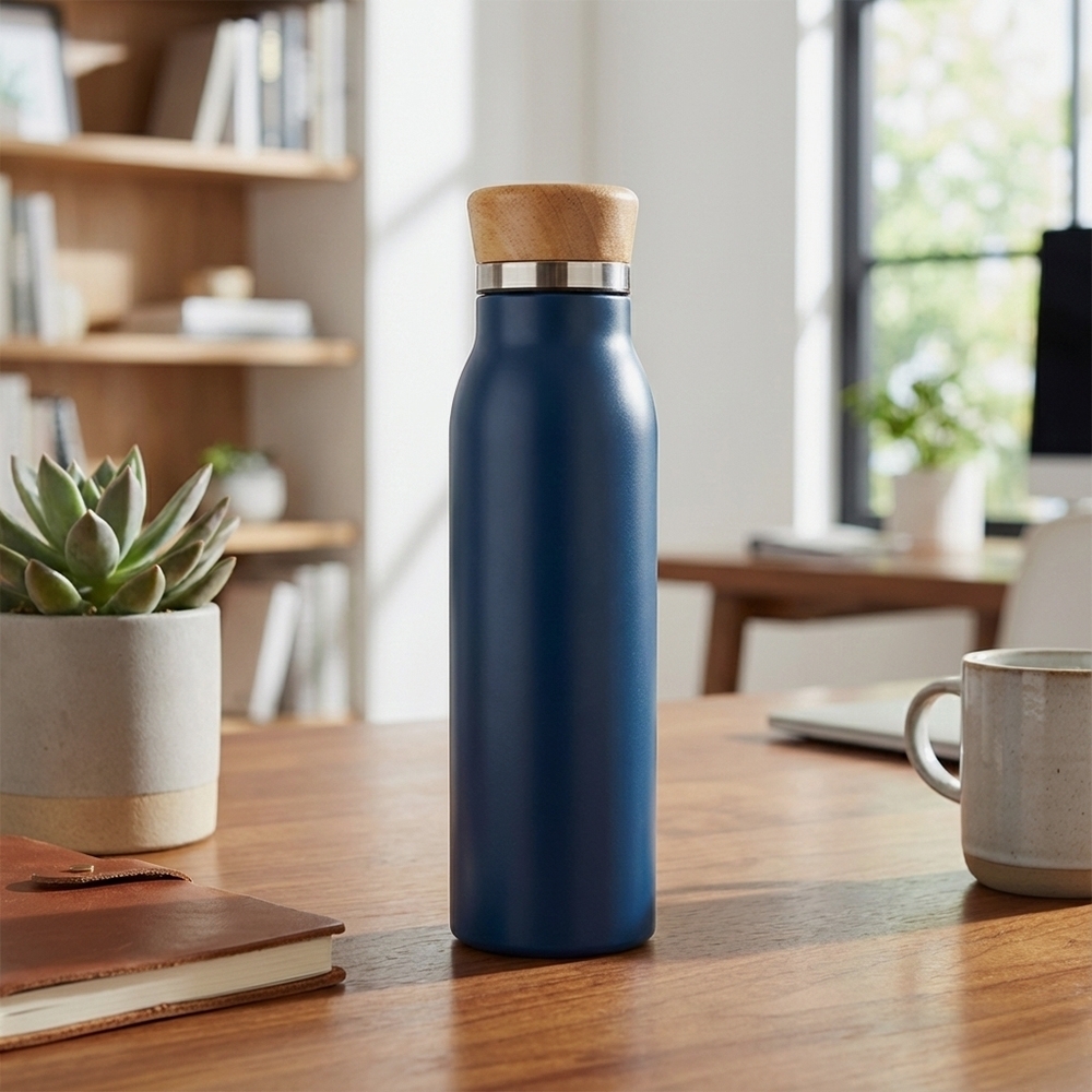 BX19072 - A garrafa térmica em inox de 600ml, com pintura em spray e tampa rosqueável em bambu, alia design moderno e eficiência térmica. Sua estrutura de parede dupla com isolamento a vácuo ajuda a manter a temperatura das bebidas por mais tempo, sendo perfeita para acompanhar a rotina de trabalho, estudos ou deslocamentos.