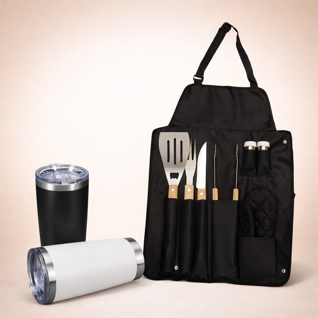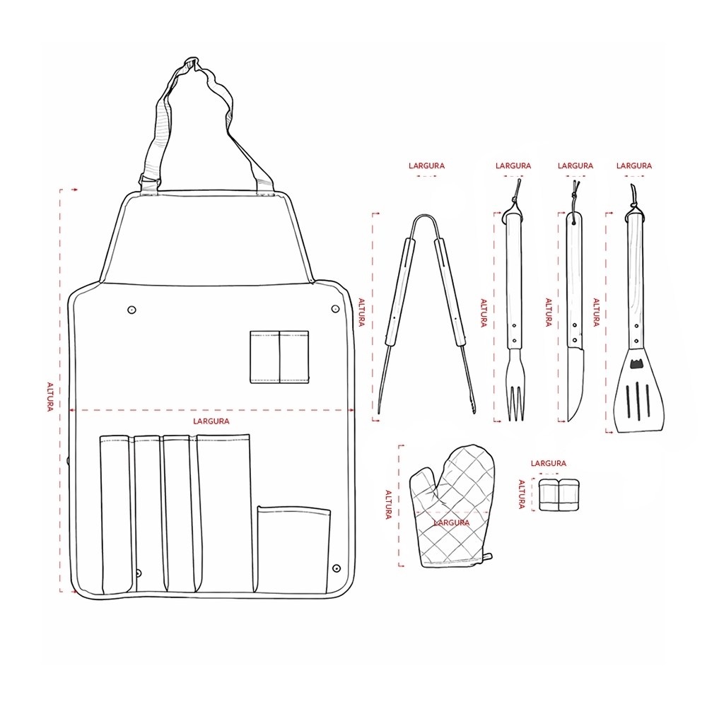 Descrição: Kit churrasco 8 peças em estojo de nylon. Contém espátula, garfo, faca, pegador, saleiro, paliteiro, luva e avental (também utilizado como estojo). Talheres de inox com acabamento de madeira e avental de nylon com alça ajustável – possui botão e alça com fivela para lacre.