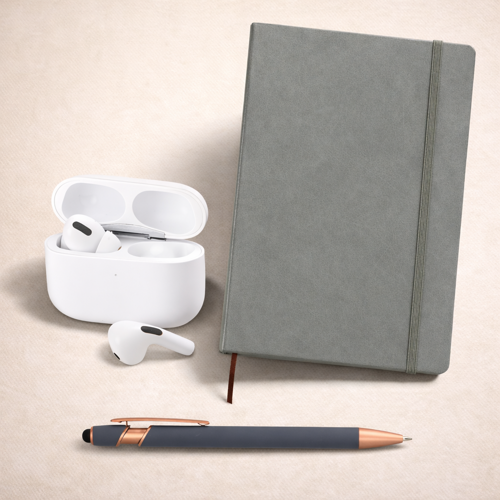 BX05006 - Caneta metálica com pintura de acabamento emborrachado e acionamento por clique. Conta com topo emborrachado para uso em dispositivos com telas sensíveis ao toque, além de carga esferográfica azul de 1,0 mm.