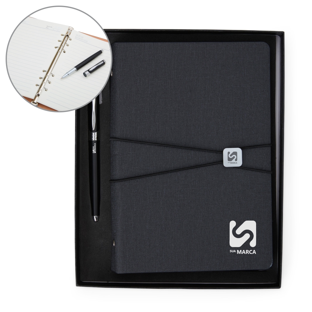 Descrição: Anote tudo e organize os cartões com o nosso Kit Executivo! Ele vem com uma caneta metálica super sofisticada de 1.0mm na cor preta e um caderno fichário de aproximadamente 96 folhas removíveis, ou seja, dá para trocar, reorganizar e deixar tudo do seu jeito! Os seis anéis garantem praticidade, e a capa dura em couro sintético traz aquele toque elegante durante os registros e planejamentos. E tem mais! São quatro espaços para cartões, sendo um com visor transparente, espaço para guardar anotações, suporte para caneta e fechamento em elástico para manter tudo seguro. Para um toque exclusivo, ainda acompanha uma plaquinha para personalização e embalagem.