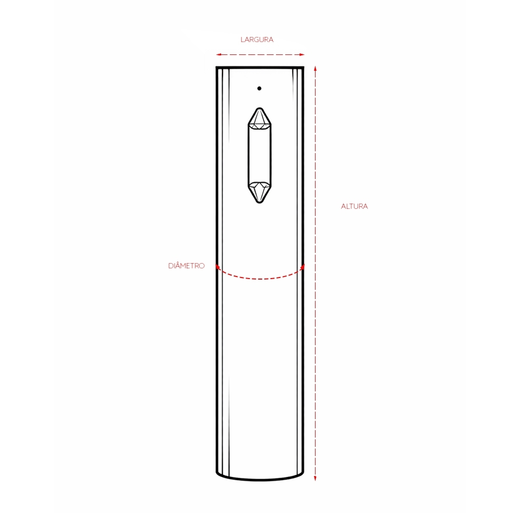 Saca-rolhas elétrico recarregável com estrutura em plástico ABS, policarbonato (PC) e broca em aço carbono. Conta com botões em formato de diamante para controle do aparelho e acompanha cabo USB-C para carregamento.