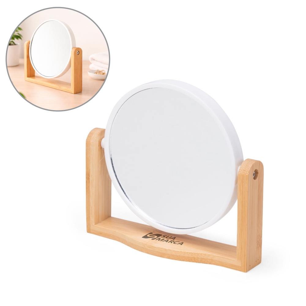 Espelho giratório com base em bambu e moldura em plástico.
