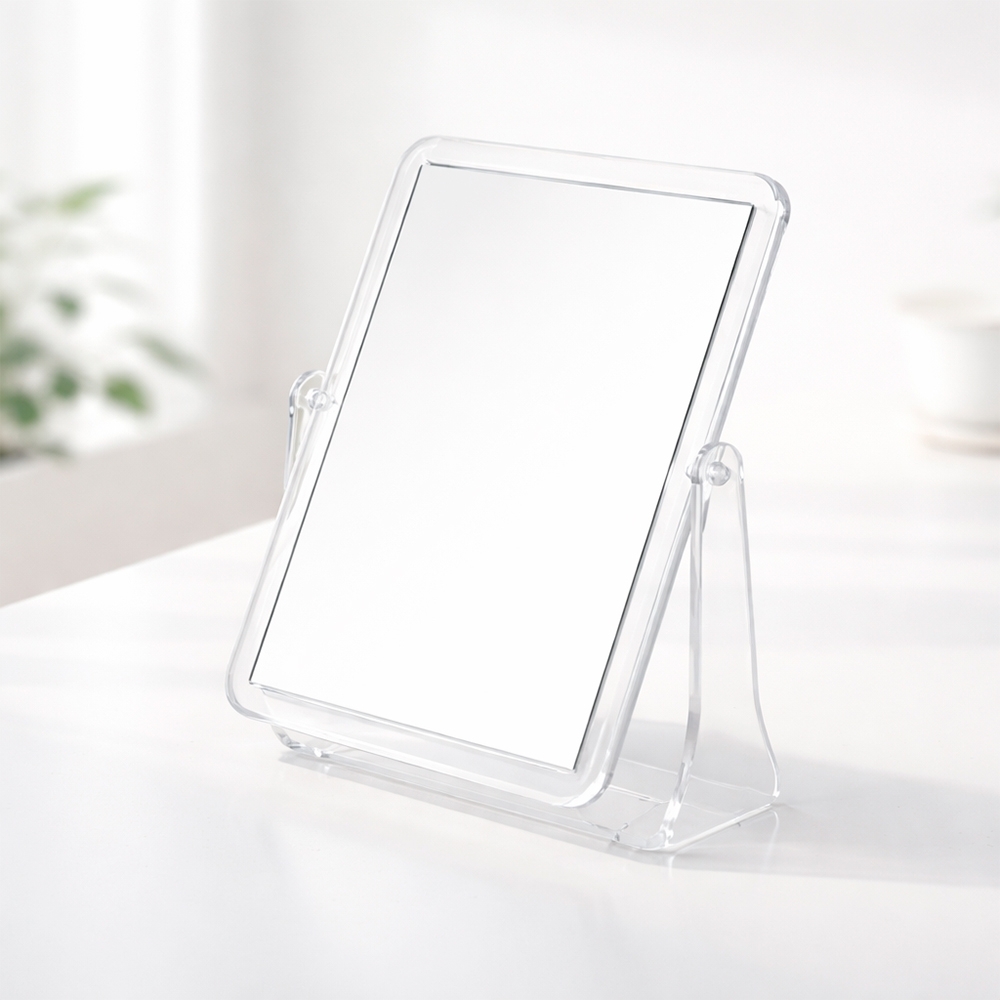 Espelho de mesa retangular giratório com face dupla sem aumento e estrutura em plástico polipropileno (PP) transparente.