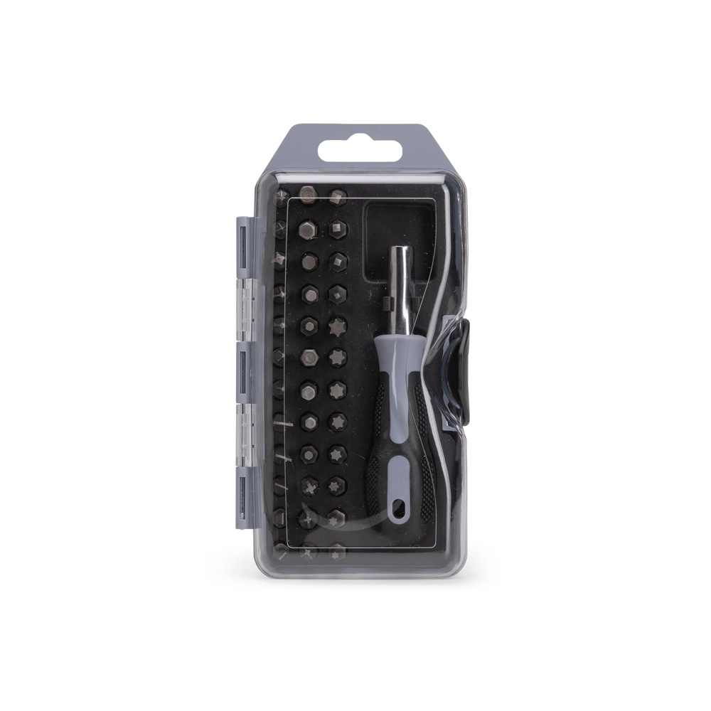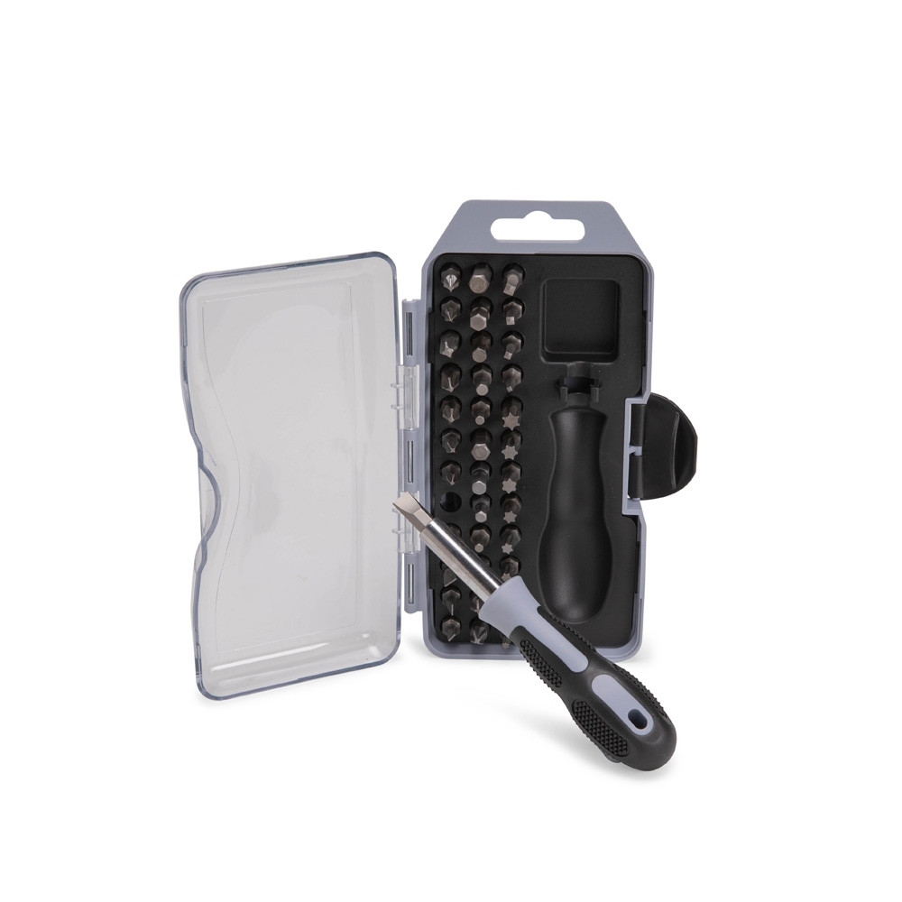 Kit de ferramentas com 37 peças. O conjunto traz uma chave porta-bits com ponta magnética e cabo ergonômico em plástico PP e TPE, além de 36 bits em formatos diferentes, incluindo: 5 com pontas de fenda, 10 Phillips, 9 Allen, 8 Torx e 4 de pontas quadradas. Acompanha caixa em plástico com tampa transparente e trava de fechamento.
