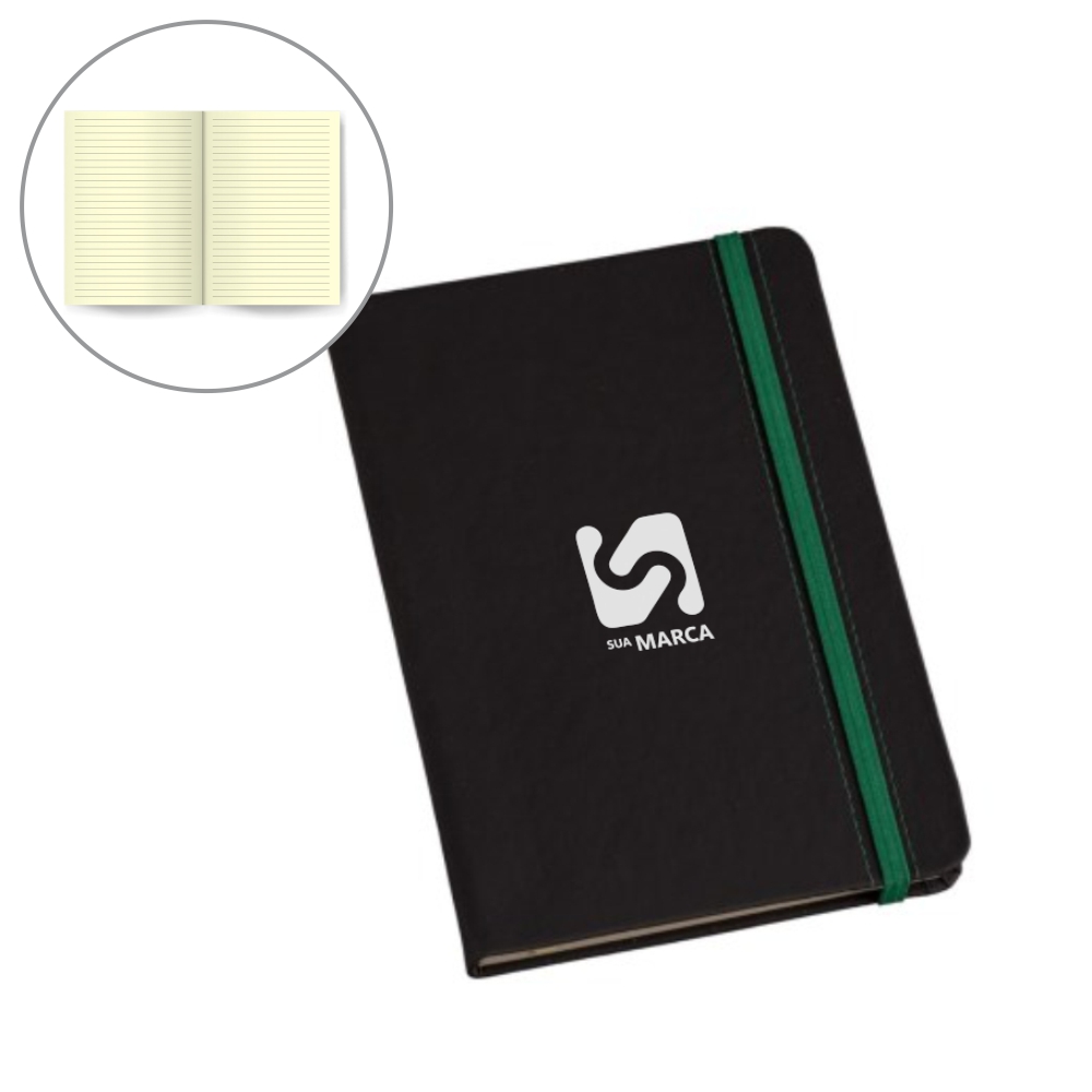 Caderneta Grande Tipo Moleskine Capa Preta com Costura e Elástico Colorido COM PAUTA - 80 Folhas Com Pauta. Formato: 14x21cm - Miolo em papel PÓLEN NATURAL levemente amarelado - 80 gramas - Capa em couro sintético emborrachado - com elástico. Formato: 13,75x20,5cm