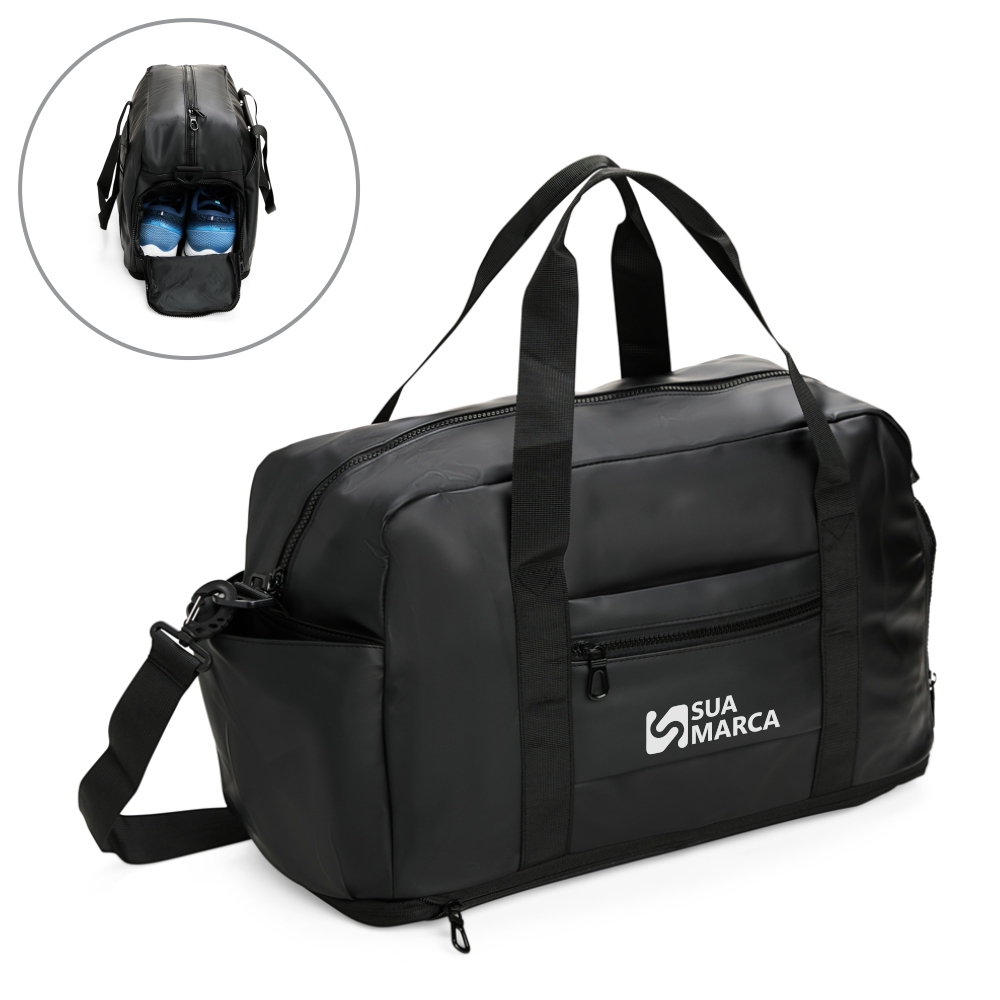 Bolsa em filme sintético tipo couro impermeável, com até 30 litros de capacidade após expansão inferior. Possui compartimento interno com bolso menor e outros quatro externos: um com botão magnético, um para calçados, um aberto e outro com zíper e encaixe para malas. Possui um par de alças laterais de mão e uma alça transversal removível.