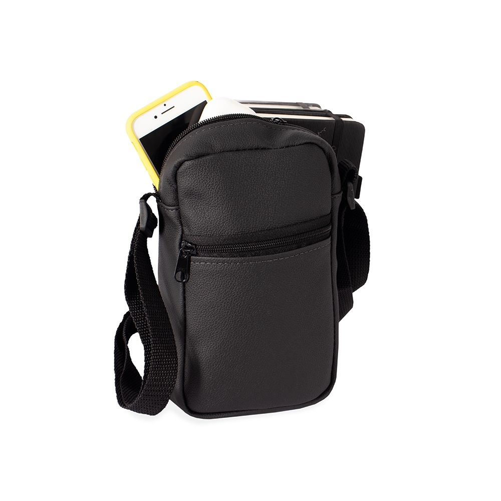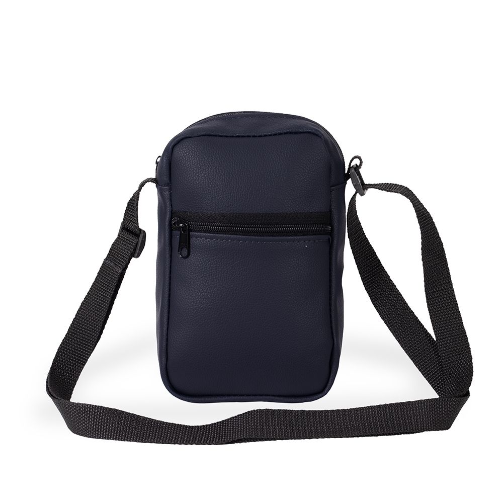 Descrição: Bolsa de ombro confeccionada em couro sintético com fechamento em zíper e alça ajustável. Possui dois compartimentos: um com bolso aberto em tecido de malha e outro localizado na parte frontal.