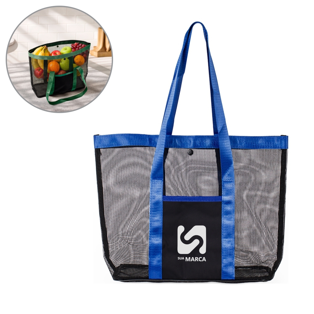 Bolsa confeccionada em tela de PVC com botão de fechamento em plástico, alças e detalhes em tecido sintético.