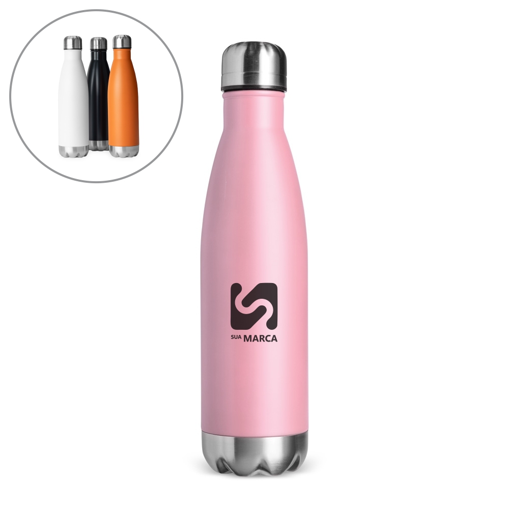 Garrafa térmica em inox com tampa rosqueável, pintura em spray e capacidade para até 500ml. Possui estrutura de parede dupla e vedação a vácuo, o que permite conservar a temperatura de líquidos por mais tempo.