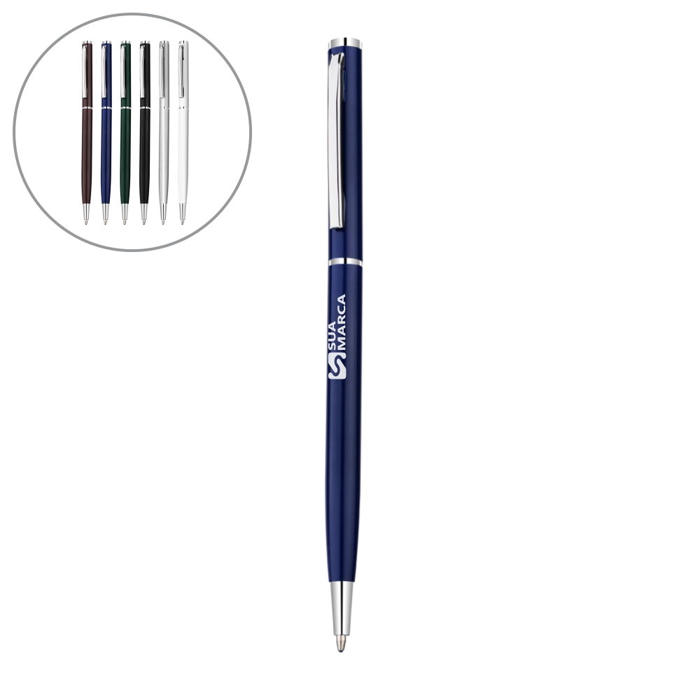 Caneta esferográfica em metal com escrita em azul, detalhe brilhoso.