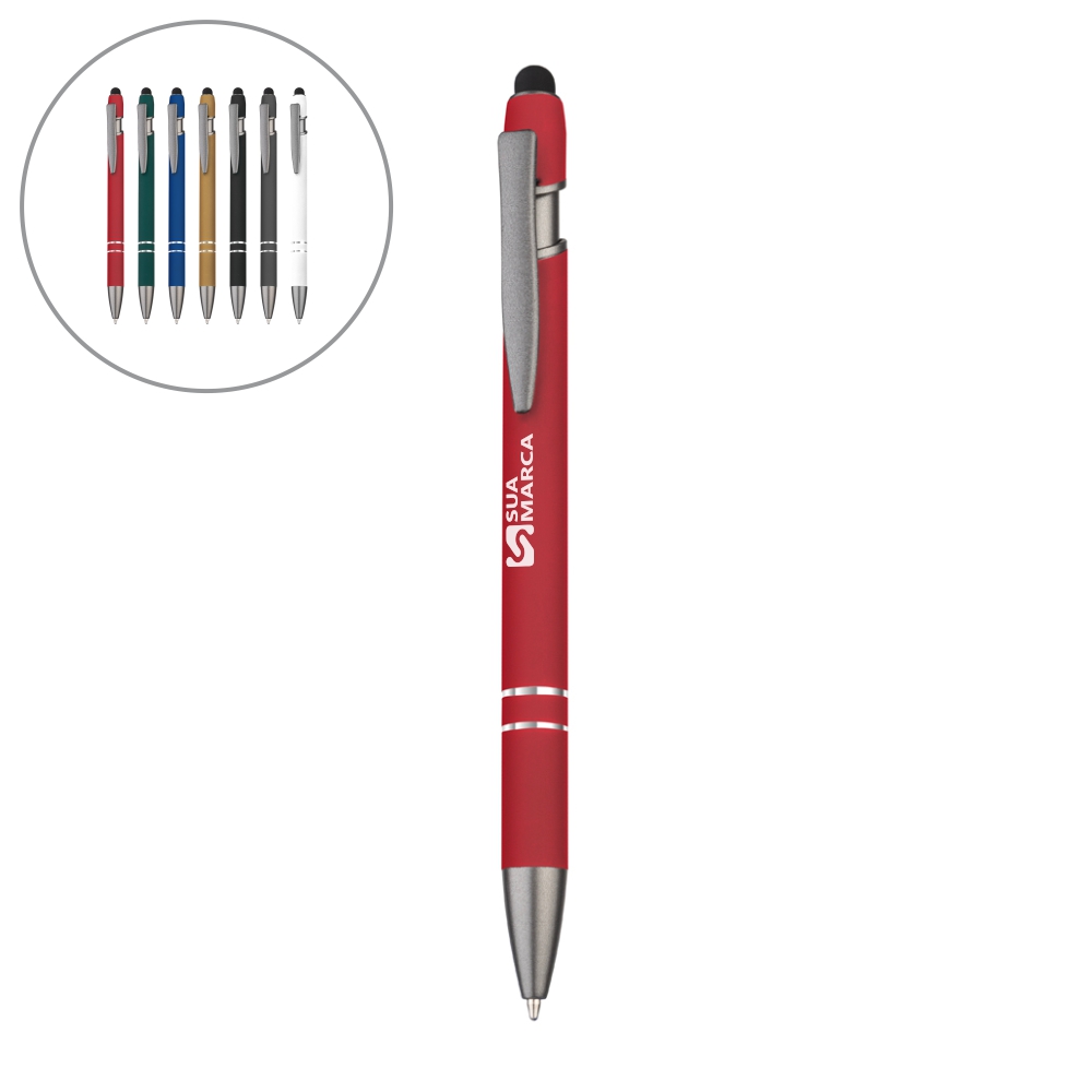 Caneta esferográfica em metal escrita em azul com cor fosca. Refil tipo parker com ponta touch emborrachada e detalhe cromado.