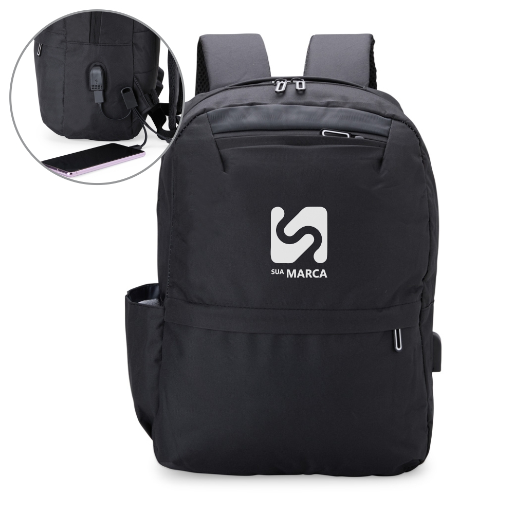 Descrição: Mochila de nylon 24 litros com três compartimentos, sendo o principal com bolso para notebook 14 polegadas. A mochila possui um bolso lateral e suporte externo usb.
