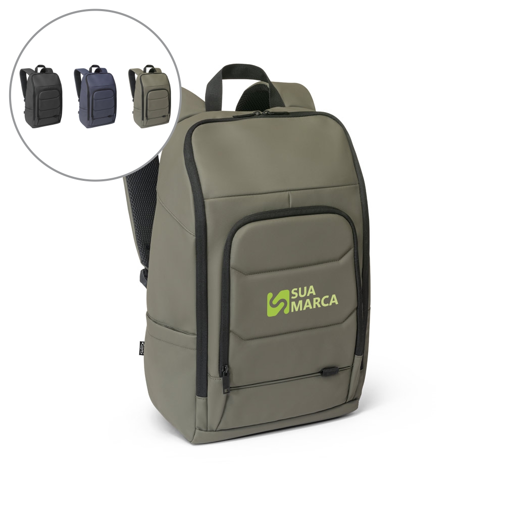 Mochila para notebook em 600D, poliéster reciclado (100% rPET), de alta densidade, com revestimento resistente à água e forro em 210D poliéster reciclado (100% rPET). Possui um compartimento principal com diversos bolsos e 2 divisórias almofadadas para notebook até 16" e tablet até 10.1". Bolso frontal com zíper com divisórias interiores. Bolso lateral ideal para transportar a sua squeeze. A parte posterior tem um acolchoamento extra e incorpora uma alça para trolley em caso de necessidade. Faixa refletora na parte da frente da mochila. Capacidade até 19 L. 300 x 460 x 160 mm