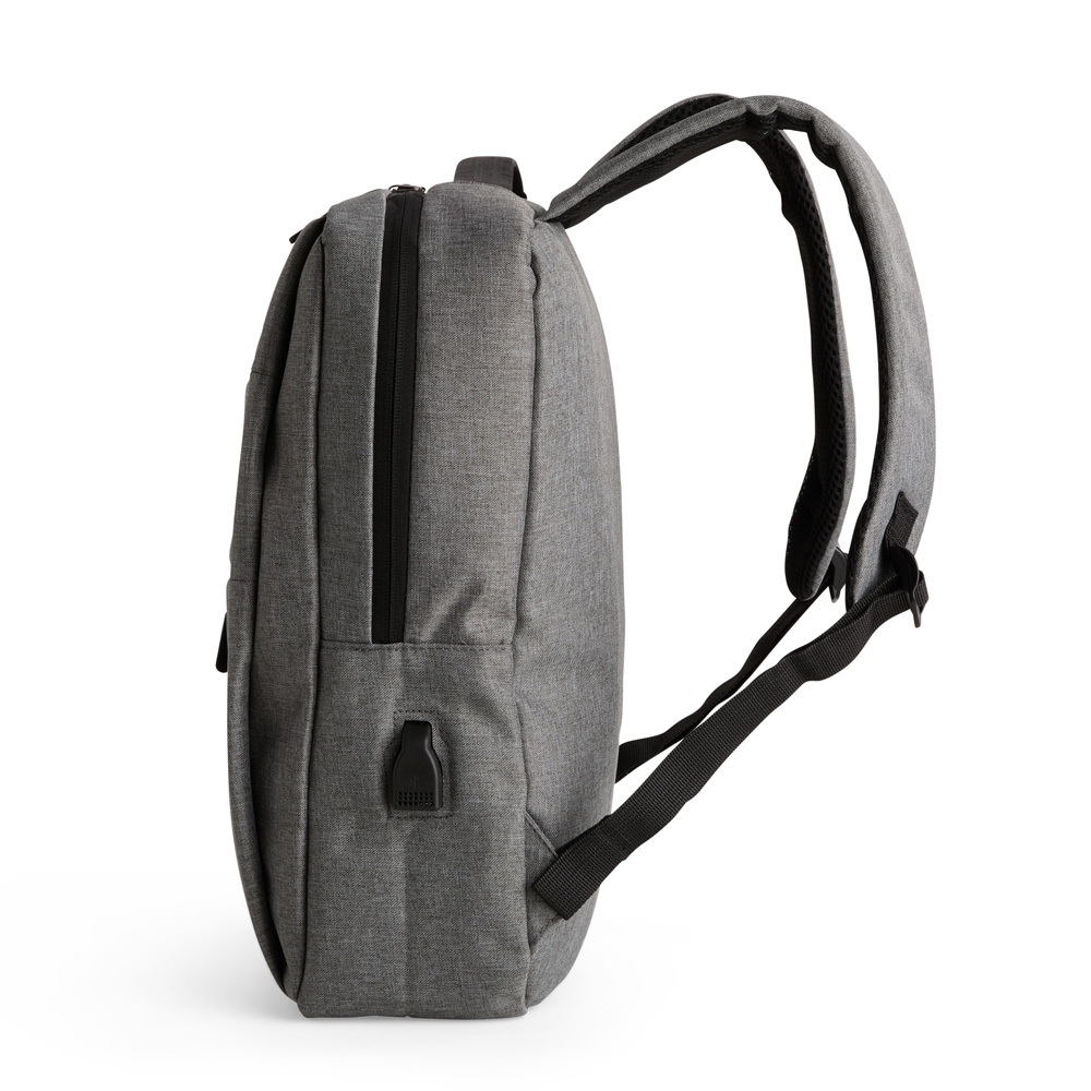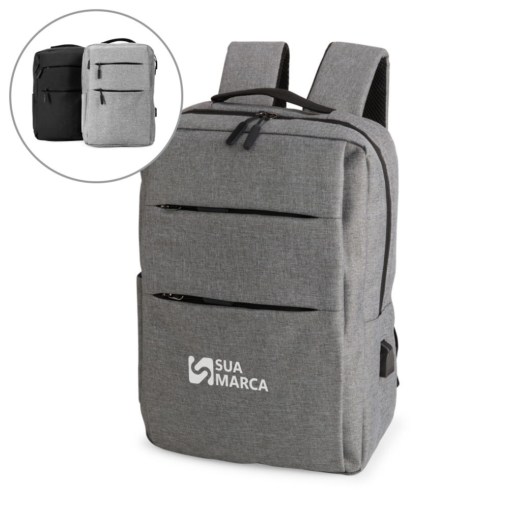 Possui três compartimentos externos, um deles com abertura lateral. Dispõe também de bolso lateral, porta USB, alça de mão em poliéster 210D e alças para as costas em tecido respirável.