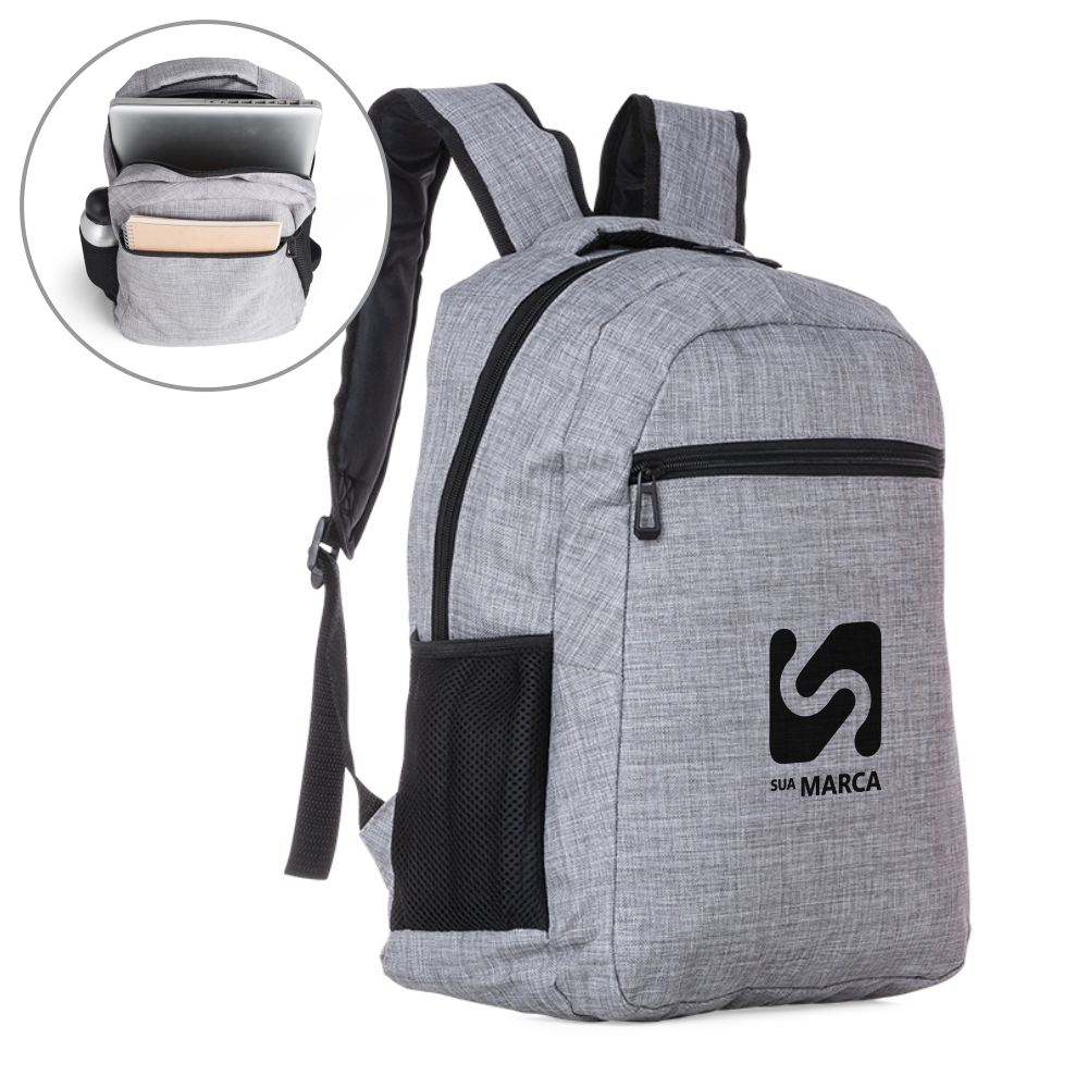 Descrição: Mochila confeccionada em poliéster com compartimento para notebook até 15,6 polegadas. Contém um compartimento grande, compartimento frontal e bolsos laterais em malha. Alça de mão com revestimento espumado e alças para as costas ajustáveis.