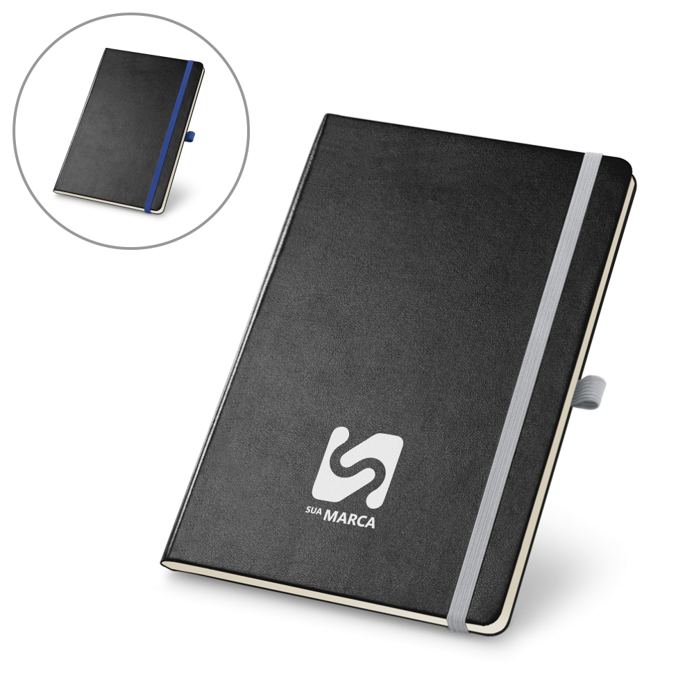 Caderno capa dura. Com porta esferográfica, bolso interior e 80 folhas não pautadas cor marfim. 137 x 210 mm.