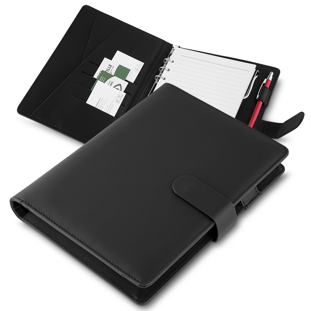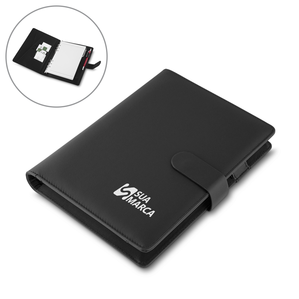 Caderno de anotações, tipo fichário, com powerbank 4.000 mAh, bateria de lítio, capa com material sintético, interior com porta documentos, cartões e caneta, 70 folhas com contra capa e fundo plástico, fechamento magnético. NÃO ACOMPANHA CANETA E SMARTPHONE.