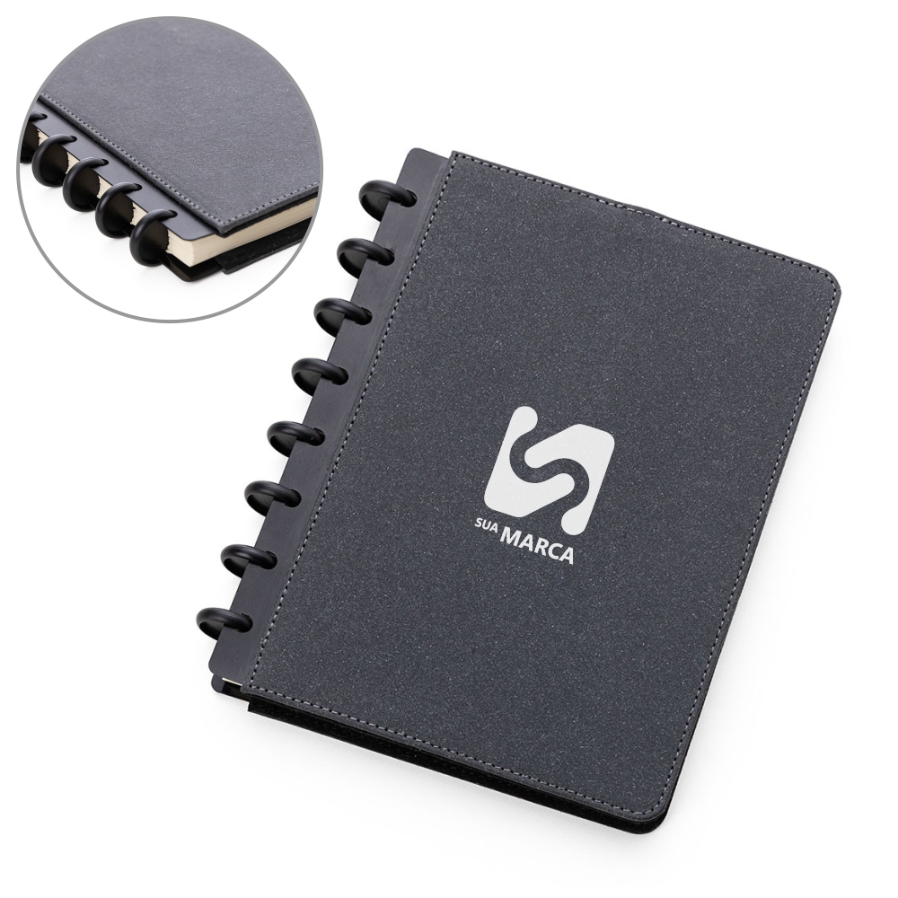 Caderno de anotações com capa dura em material sintético, contendo: Miolo de 80 folhas pautadas na cor bege, Porta Canetas e Porta Cartões. Obs: As folhas do miolo são destacáveis.