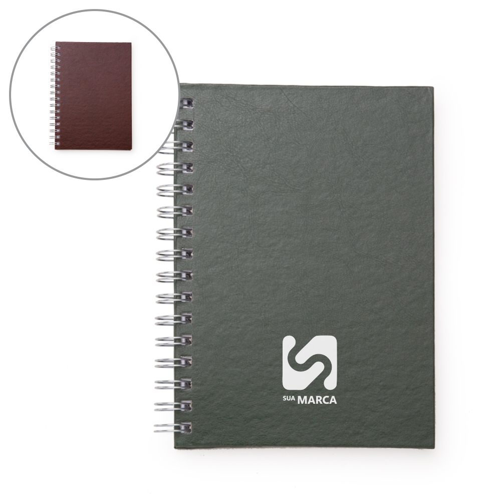 Caderno pequeno com capa de couro sintético texturizado e espiral prata metálico. Possui aproximadamente 96 folhas brancas pautadas e páginas para: dados pessoais, calendário de 2018 à 2021 e planejamento.