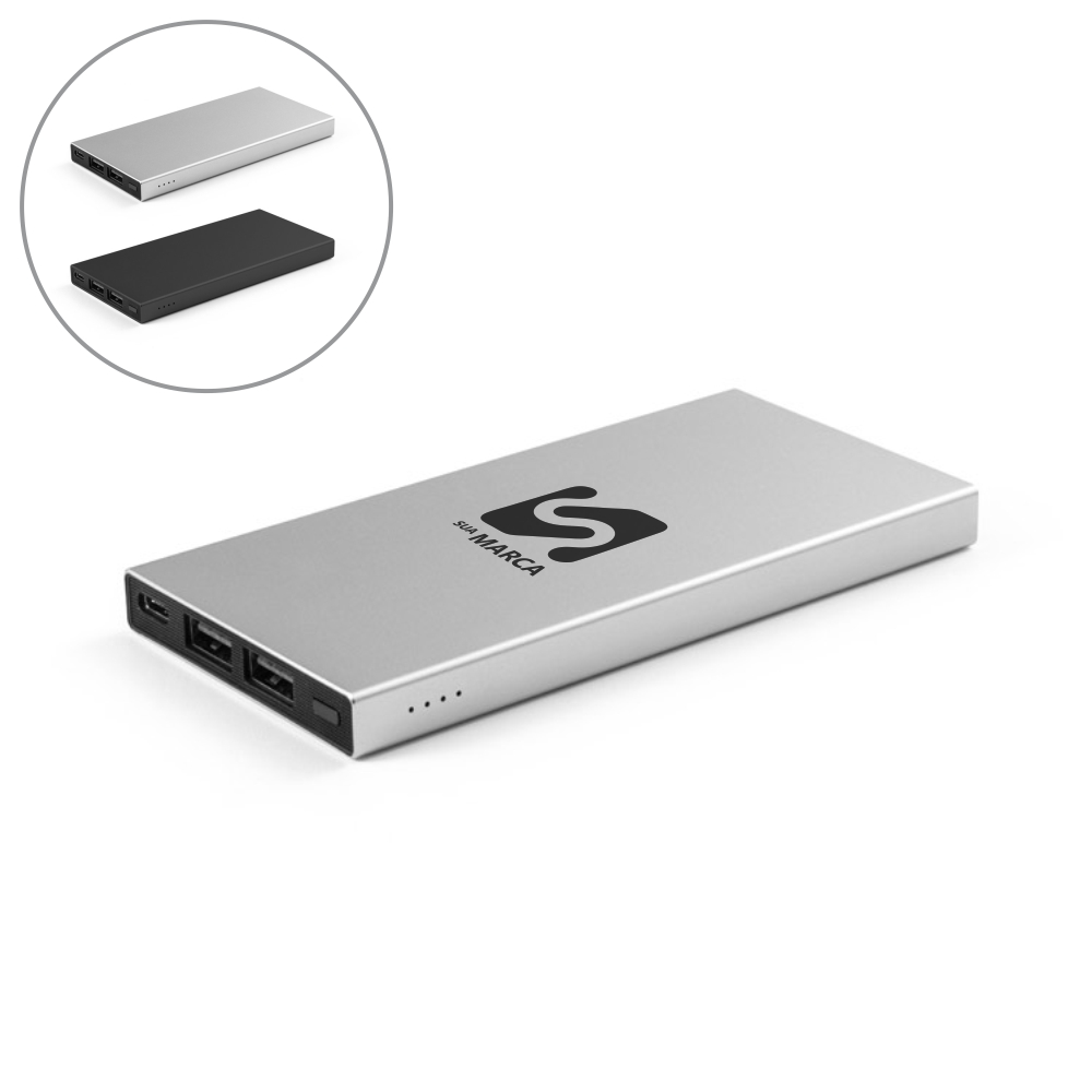 Bateria portátil em alumínio 100% reciclado. A bateria em lítio tem capacidade de 5.000 mAh e tempo de vida ≥ 500 ciclos. Possui uma entrada/saída USB-C e duas saídas USB-A. Incluso cabo de carregamento rápido USB-C. Fornecida em caixa presente de papel kraft reciclado. 11 x 130 x 64 mm | Caixa: 82 x 20 x 131 mm