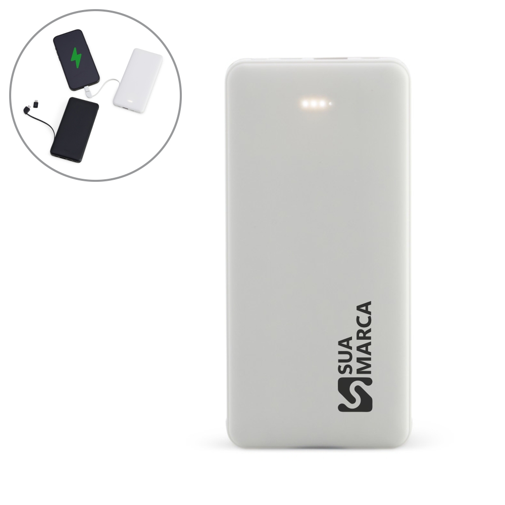 Power bank plástico de 10.000mAh com indicadores led de bateria e cabos acoplados: Tipo-C e V8. Acompanha cabo USB V8 e adaptador Lightning.