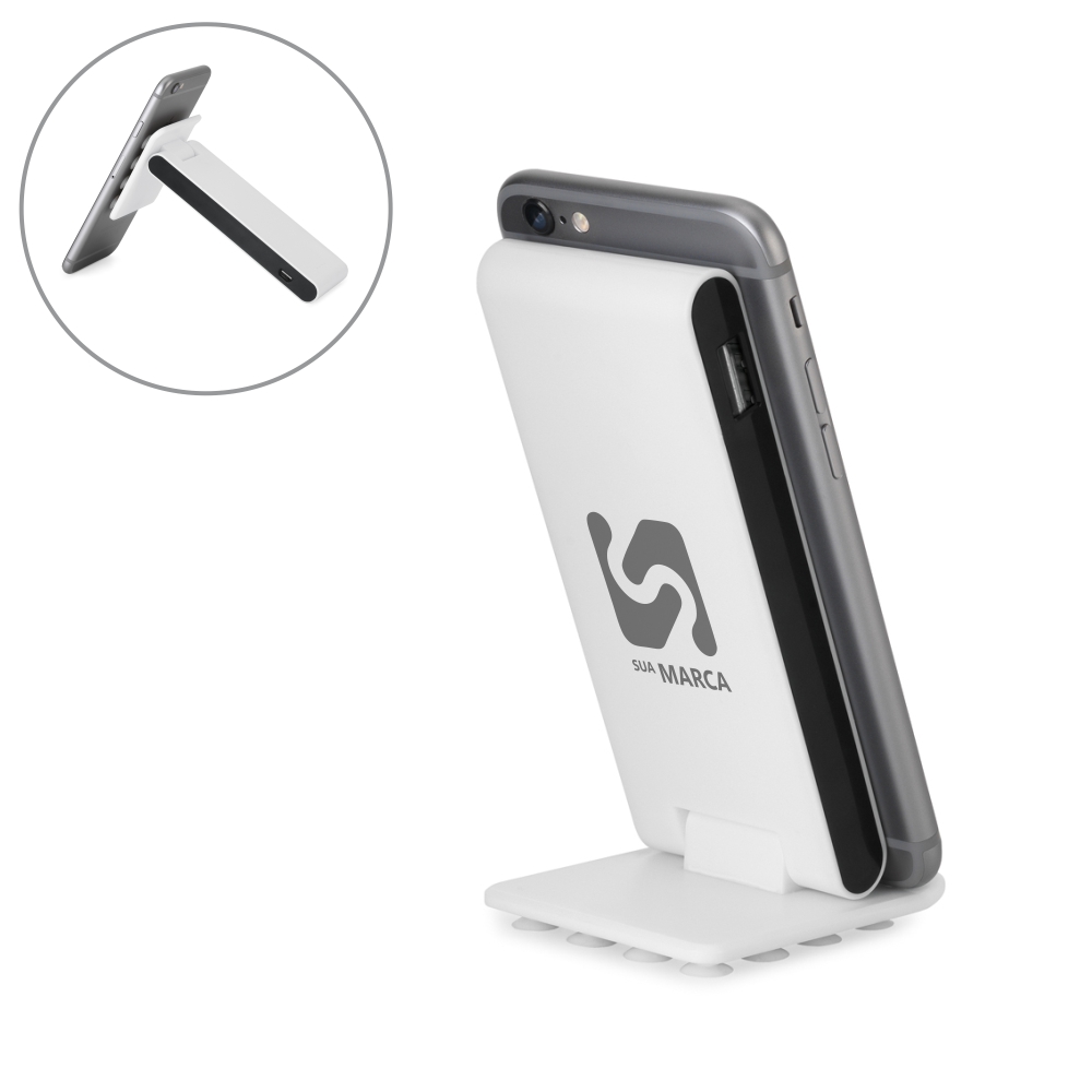Powe Bank. Bateria portátil. ABS. Com ventosas na base. Bateria de lítio. Capacidade: 4.000 mAh. Tempo de vida ≥ 500 ciclos. Com entrada/saída 5V/1A. Incluso cabo USB/micro USB para carregar a bateria. Bateria: 123 x 50 x 14 mm | Base: 65 x 58 x 10 mm.