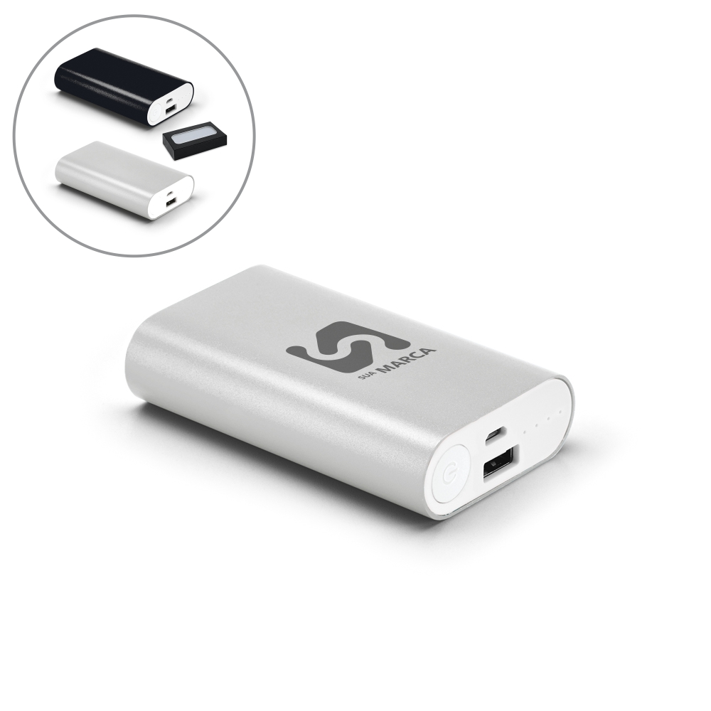Powe Bank. Bateria portátil. Alumínio. Bateria de lítio. Capacidade: 4.400 mAh. Tempo de vida ≥ 500 ciclos. Com entrada/saída 5V/1A. Incluso cabo USB/micro USB para carregar a bateria. Fornecida em caixa presente. 91 x 56 x 24 mm | Caixa: 105 x 75 x 25 mm.
