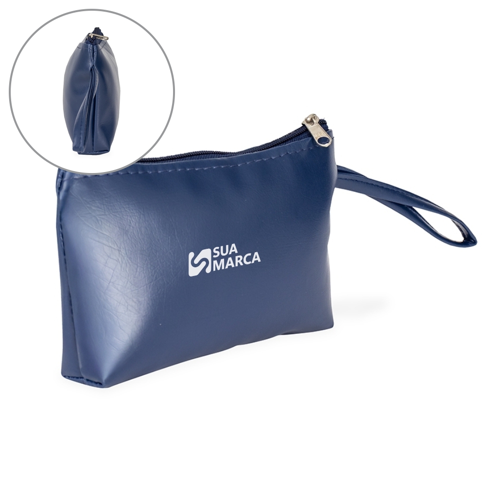 Nécessaire em couro sintético resistente à água, fechamento em zíper e alça lateral para transporte.