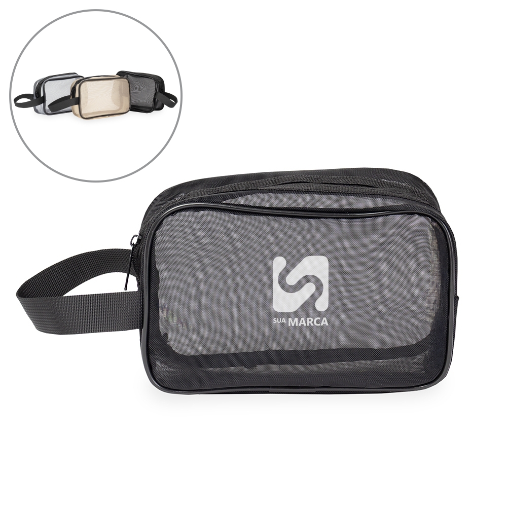 Nécessaire confeccionada em tela de nylon com fechamento em zíper e alça lateral para transporte.