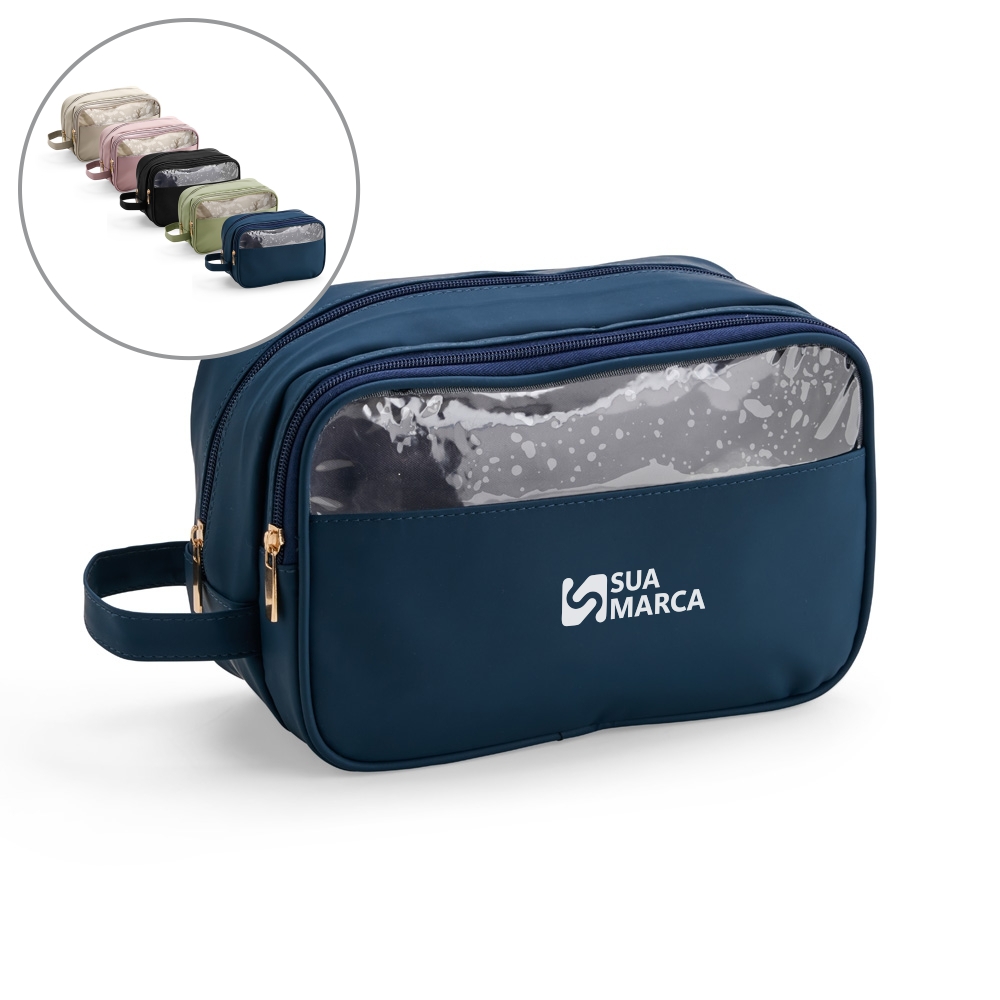 Nécessaire confeccionada em filme sintético de poliuretano impermeável. Possui dois bolsos no compartimento interno principal, sendo um com fechamento em zíper e outro em tela de nylon. Dispõe ainda de compartimento frontal com viseira e revestimento interno em PVC, ideal para guardar itens molhados.